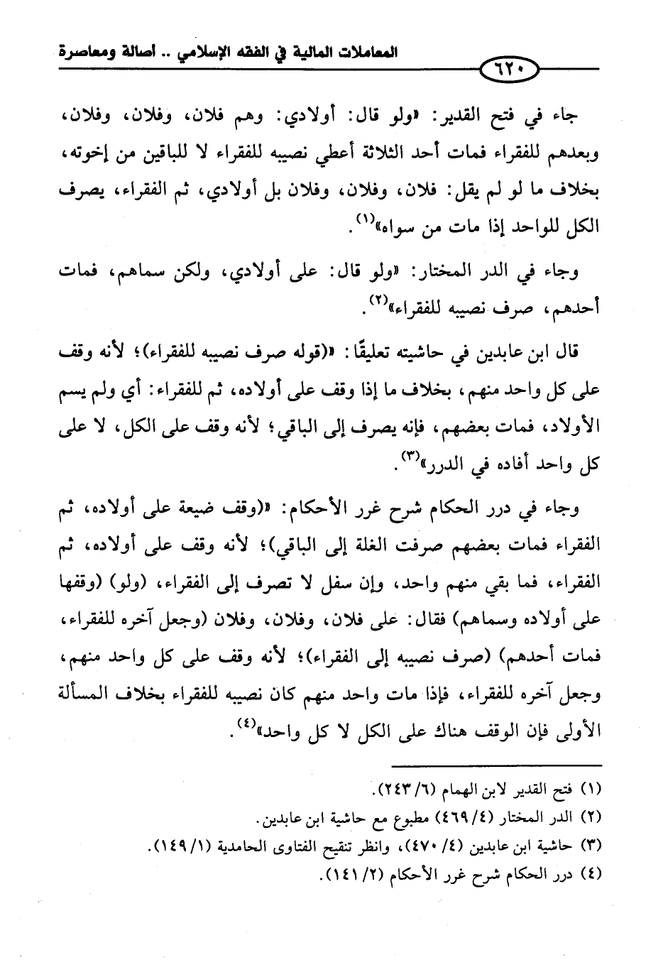 وجاء في درر الحكام شرح غرر الأحكام: " (وقف ضيعة على أولاده، ثم الفقراء فمات بعضهم صرفت الغلة إلى الباقي)؛ لأنه وقف على أولاده، ثم الفقراء، فما بقي منهم واحد، وإن سفل لا تصرف إلى الفقراء، (ولو) (وقفها على أولاده وسماهم) فقال: على فلان، وفلان، وفلان (وجعل آخره للفقراء، فمات أحدهم) (صرف نصيبه إلى الفقراء)؛ لأنه وقف على كل واحد منهم، وجعل آخره للفقراء، فإذا مات واحد منهم كان نصيبه للفقراء بخلاف المسألة الأولى فإن الوقف هناك على الكل لا كل واحد" (¬٤).