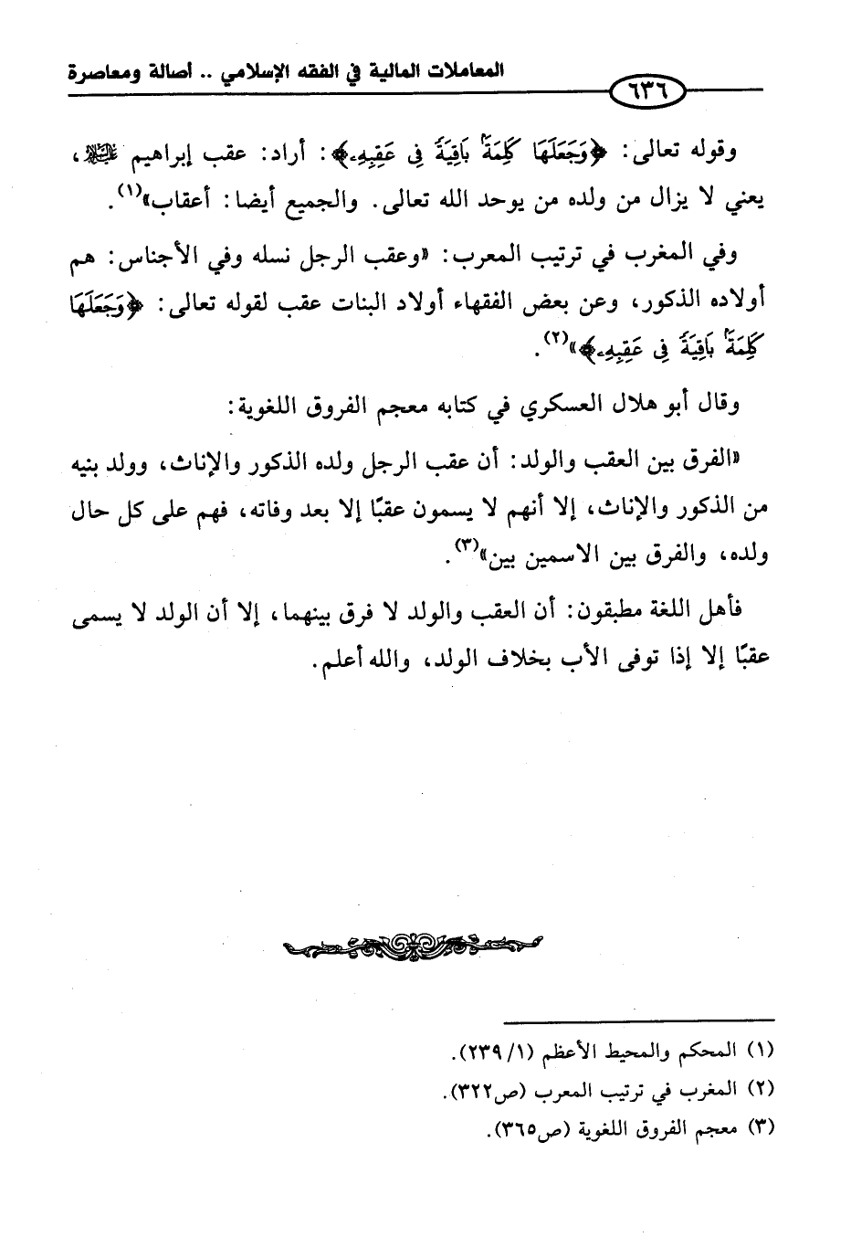 وفي المغرب في ترتيب المعرب: "وعقب الرجل نسله وفي الأجناس: هم أولاده المذكور، وعن بعض الفقهاء أولاد البنات عقب لقوله تعالى: {وَجَعَلَهَا كَلِمَةً بَاقِيَةً في عَقِبِهِ} (¬٢).