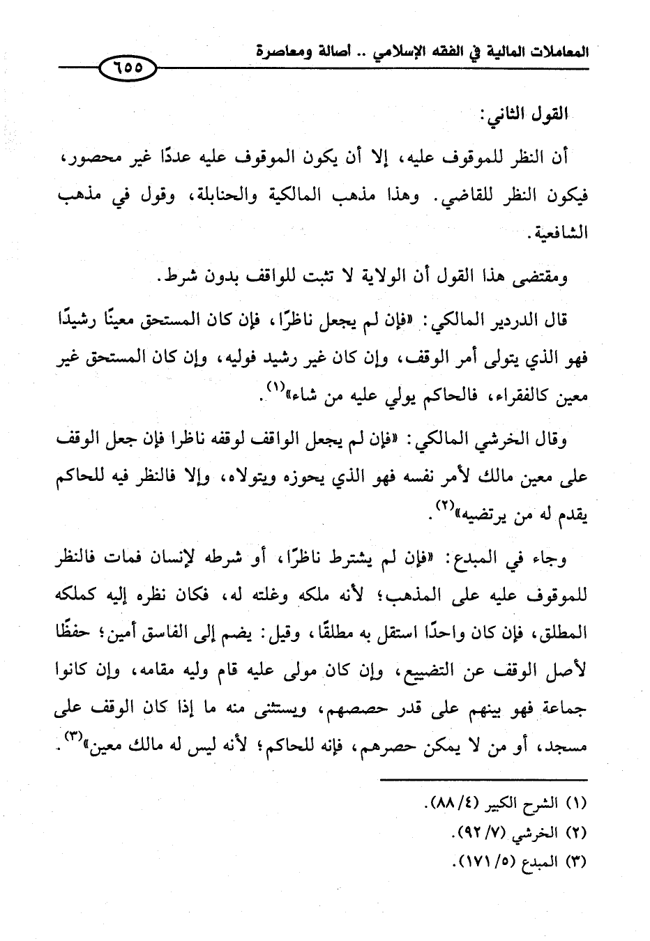 وجاء في المبدع: "فإن لم يشترط ناظرًا، أو شرطه لإنسان فمات فالنظر للموقوف عليه على المذهب؛ لأنه ملكه وغلته له، فكان نظره إليه كملكه المطلق، فإن كان واحدًا استقل به مطلقًا، وقيل: يضم إلى الفاسق أمين؛ حفظًا لأصل الوقف عن التضييع، وإن كان مولى عليه قام وليه مقامه، وإن كانوا جماعة فهو بينهم على قدر حصصهم، ويستثنى منه ما إذا كان الوقف على مسجد، أو من لا يمكن حصرهم، فإنه للحاكم؛ لأنه ليس له مالك معين" (¬٣).