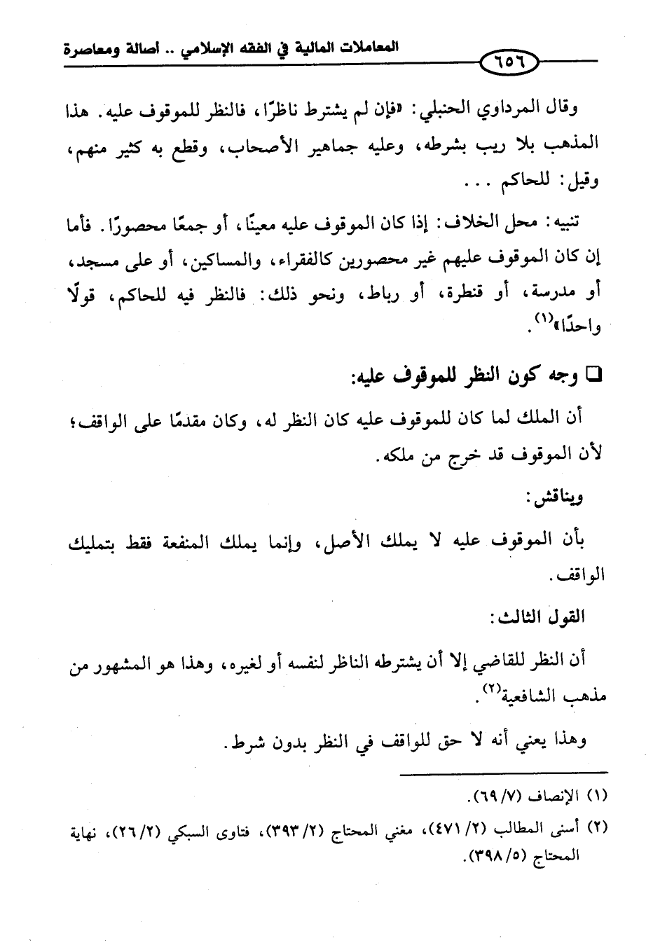 وقال المرداوي الحنبلي: "فإن لم يشترط ناظرًا، فالنظر للموقوف عليه. هذا المذهب بلا ريب بشرطه، وعليه جماهير الأصحاب، وقطع به كثير منهم، وقيل: للحاكم ...