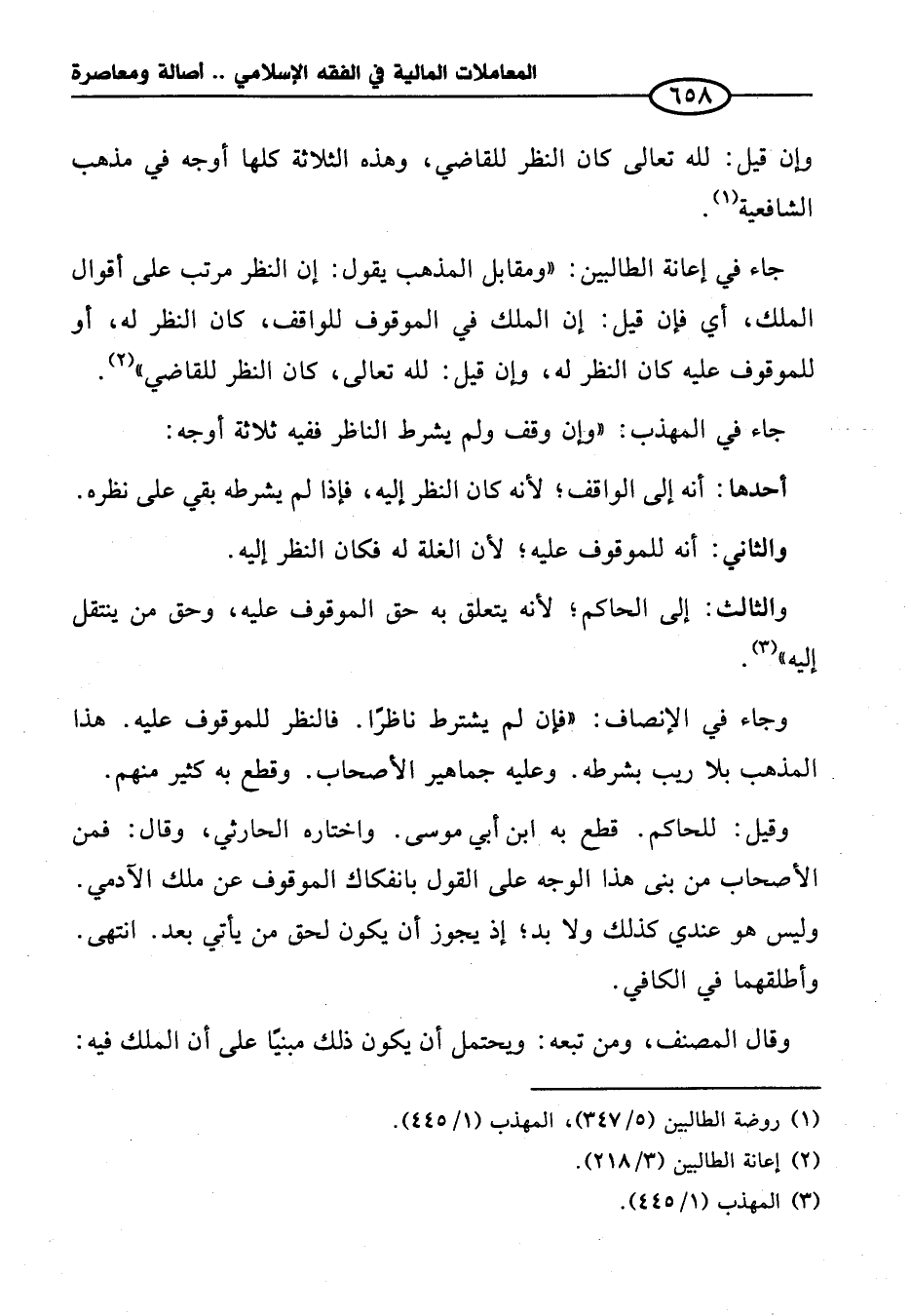 جاء في إعانة الطالبين: "ومقابل المذهب يقول: إن النظر مرتب على أقوال الملك، أي فإن قيل: إن الملك في الموقوف للواقف، كان النظر له، أو للموقوف عليه كان النظر له، وإن قيل: لله تعالى، كان النظر للقاضي" (¬٢).
