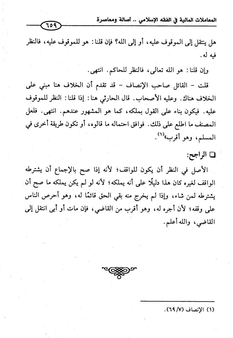 قلت -القائل صاحب الإنصاف- قد تقدم أن الخلاف هنا مبني على الخلاف هناك. وعليه الأصحاب. قال الحارثي هنا: إذا قلنا: النظر للموقوف عليه. فيكون بناء على القول بملكه، كما هو المشهور عندهم. انتهى. فلعل المصنف ما اطلع على ذلك. فوافق احتماله ما قالوه، أو تكون طريقة أخرى في المسلم، وهو أقرب" (¬١).