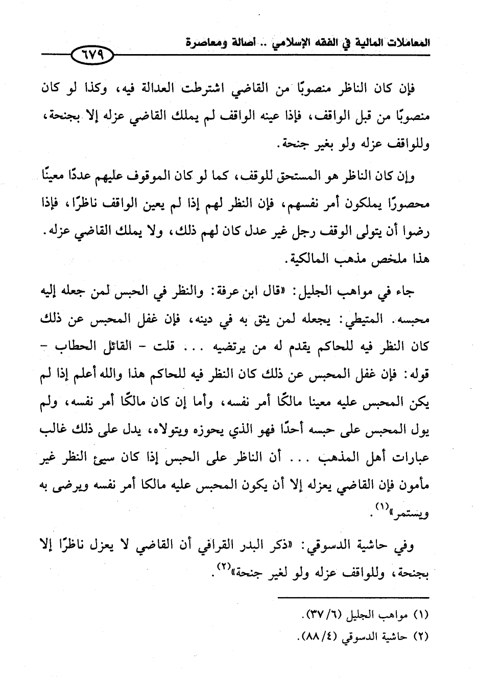 وفي حاشية الدسوقي: "ذكر البدر القرافي أن القاضي لا يعزل ناظرًا إلا بجنحة، وللواقف عزله ولو لغير جنحة" (¬٢).