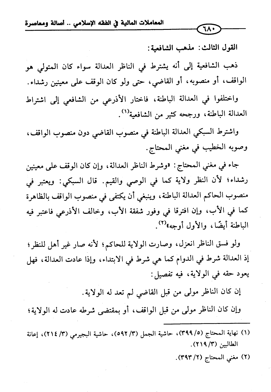 جاء في مغني المحتاج: "وشرط الناظر العدالة، وإن كان الوقف على معينين رشداء؛ لأن النظر ولاية كما في الوصي والقيم. قال السبكي: ويعتبر في منصوب الحاكم العدالة الباطنة، وينبغي أن يكتفى في منصوب الواقف بالظاهرة كما في الأب، وإن افترقا في وفور شفقة الأب، وخالف الأذرعي فاعتبر فيه الباطنة أيضًا، والأول أوجه" (¬٢).