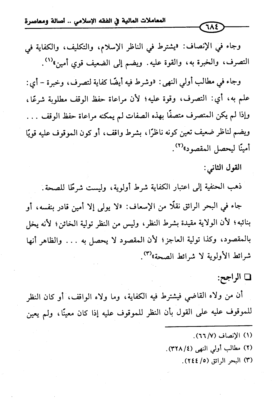 وجاء في مطالب أولي النهى: "وشرط فيه أيضًا كفاية لتصرف، وخبرة -أي: علم به، أي: التصرف، وقوة عليه؛ لأن مراعاة حفظ الوقف مطلوبة شرعًا، وإذا لم يكن المتصرف متصفًا بهذه الصفات لم يمكنه مراعاة حفظ الوقف ... ويضم لناظر ضعيف تعين كونه ناظرًا، بشرط واقف، أو كون الموقوف عليه قويًا أمينًا ليحصل المقصود" (¬٢).