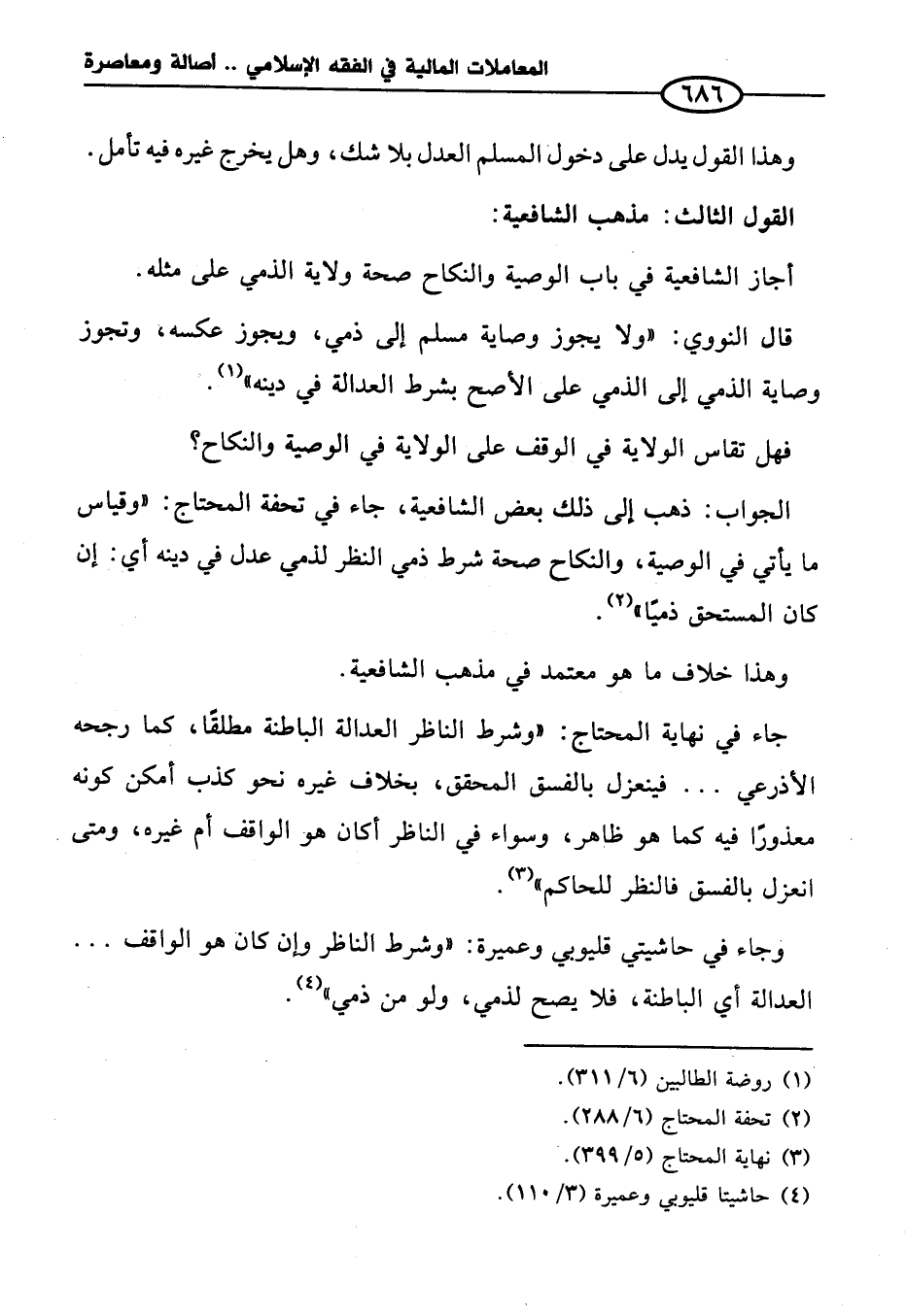 وجاء في حاشيتي قليوبي وعميرة: "وشرط الناظر وإن كان هو الواقف ... العدالة أي الباطنة، فلا يصح لذمي، ولو من ذمي" (¬٤).
