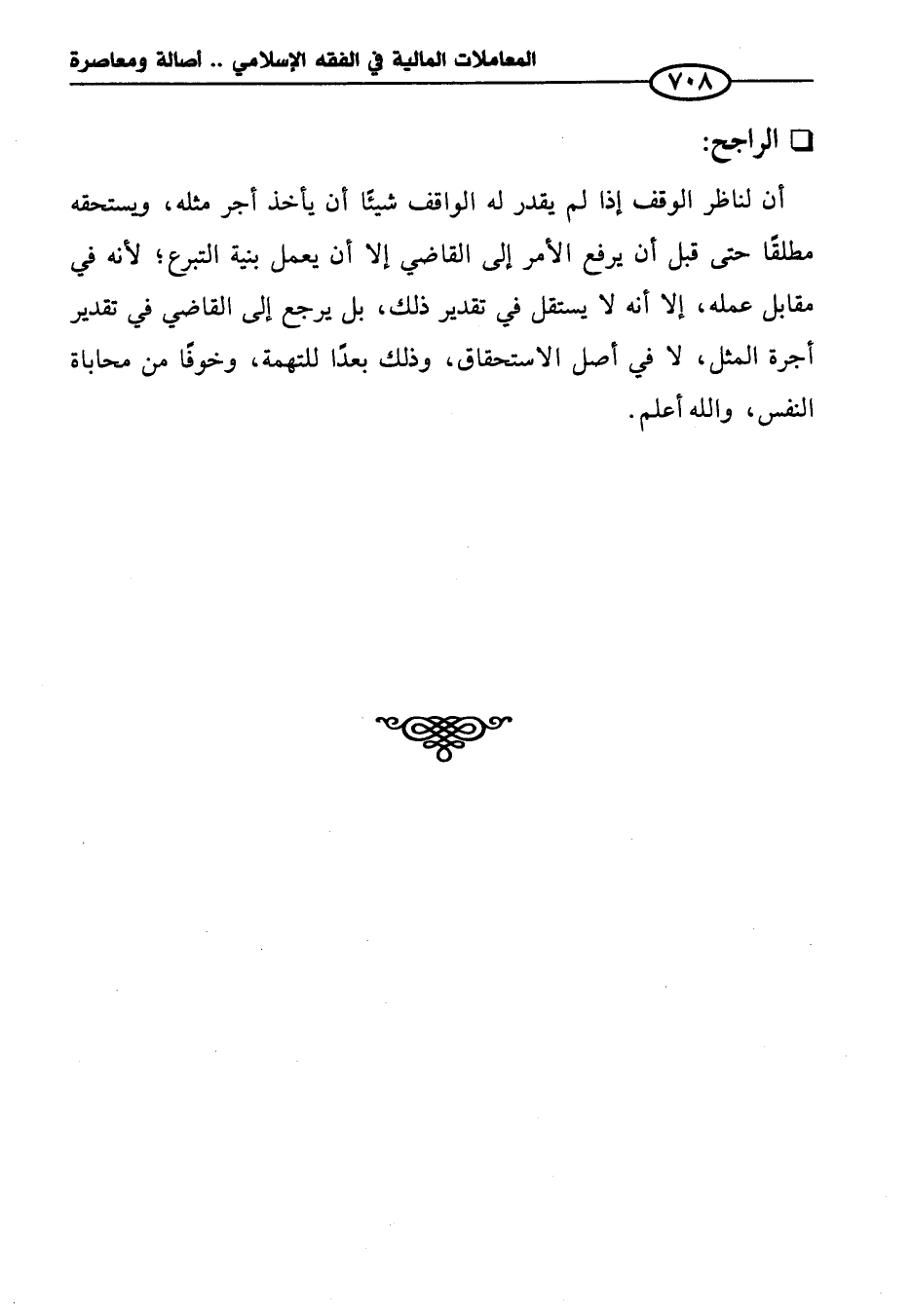 أن لناظر الوقف إذا لم يقدر له الواقف شيئًا أن يأخذ أجر مثله، ويستحقه مطلقًا حتى قبل أن يرفع الأمر إلى القاضي إلا أن يعمل بنية التبرع؛ لأنه في مقابل عمله، إلا أنه لا يستقل في تقدير ذلك، بل يرجع إلى القاضي في تقدير أجرة المثل، لا في أصل الاستحقاق، وذلك بعدًا للتهمة، وخوفًا من محاباة النفس، والله أعلم.