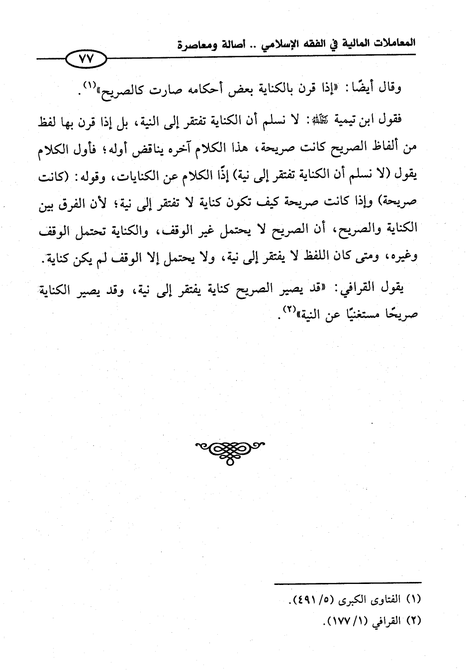 فقدل ابن تيمية -رحمه الله -: لا نسلم أن الكناية تفتقر إلى النية، بل إذا قرن بها لفظ من ألفاظ الصريح كانت صريحة، هذا الكلام آخره يناقض أوله؛ فأول الكلام يقول (لا نسلم أن الكناية تفتقر إلى نية) إذا الكلام عن الكنايات، وقوله: (كانت صريحة) وإذا كانت صريحة كيف تكون كناية لا تفتقر إلى نية؛ لأن الفرق بين الكناية والصريح، أن الصريح لا يحتمل غير الوقف، والكناية تحتمل الوقف وغيره، ومتى كان اللفظ لا يفتقر إلى نية، ولا يحتمل إلا الوقف لم يكن كناية.