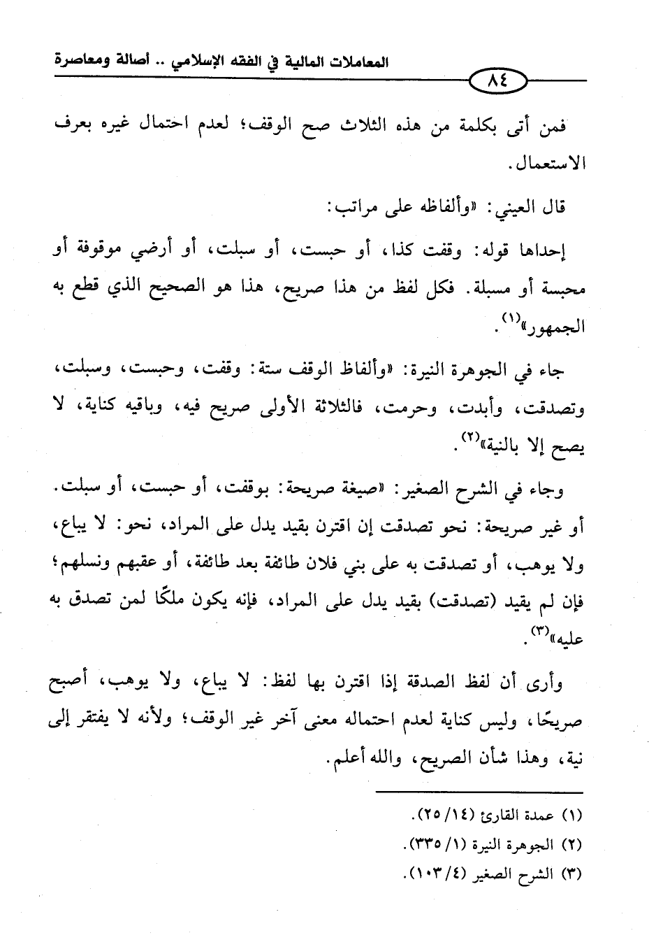وأرى أن لفظ الصدقة إذا اقترن بها لفظ: لا يباع، ولا يوهب، أصبح صريحًا، وليس كناية لعدم احتماله معنى آخر غير الوقف؛ ولأنه لا يفتقر إلى نية، وهذا شأن الصريح، والله أعلم.