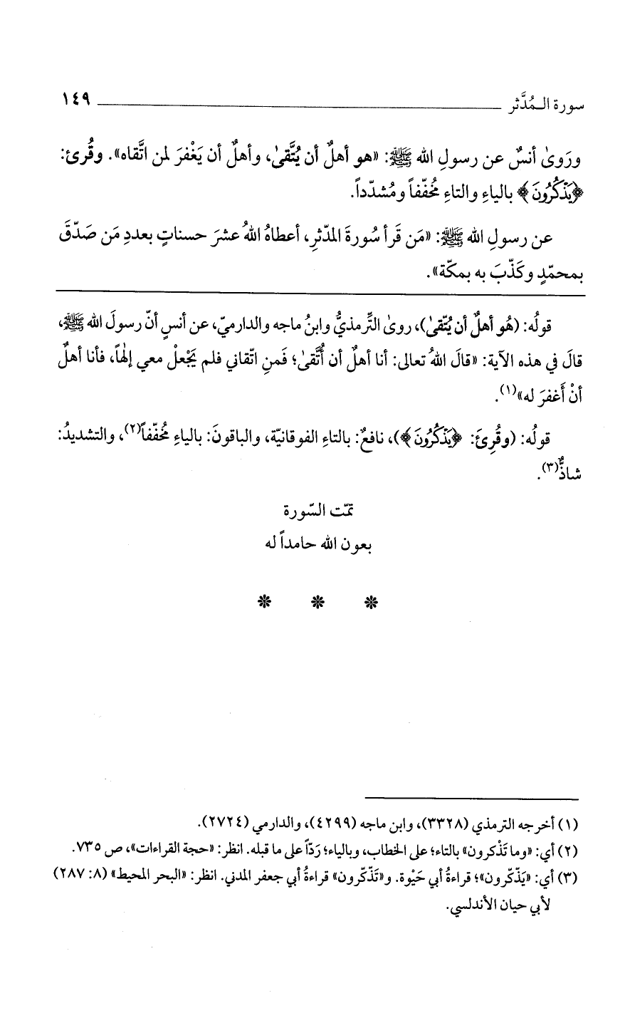 عن رسول الله صلى الله عليه وسلم: «من قرأ سورة المدثر أعطاه الله عشر حسنات بعدد من صدق بمحمد وكذب به بمكة».