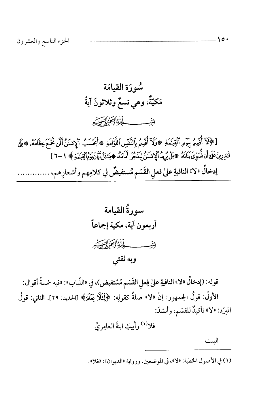 [(لا أُقْسِمُ بِيَوْمِ القِيَامَةِ • ولا أُقْسِمُ بِالنَّفْسِ اللَّوَّامَةِ • أَيَحْسَبُ الإنْسَانُ أَن لَّن نَّجْمَعَ عِظَامَهُ • بَلَى قَادِرِينَ عَلَى أَن نُّ-سَوِّيَ بَنَانَهُ • بَلْ يُرِيدُ الإنسَانُ لِيَفْجُرَ أَمَامَهُ • يَسْأَلُ أَيَّانَ يَوْمُ القِيَامَةِ) 1 - 6]