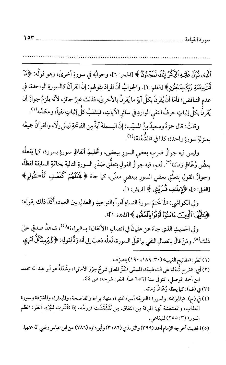 وفي الحديث الذي جاء عن عثمان في اتصال "الأنفال" بـ "براءة"، شاهد صدق على ذلك. ومن قال باتصال النفي بما قبل السورة، لعلَّه ذهب إلى أنه رد لقوله: {بَلْ يُرِيدُ كُلُّ امْرِئٍ
