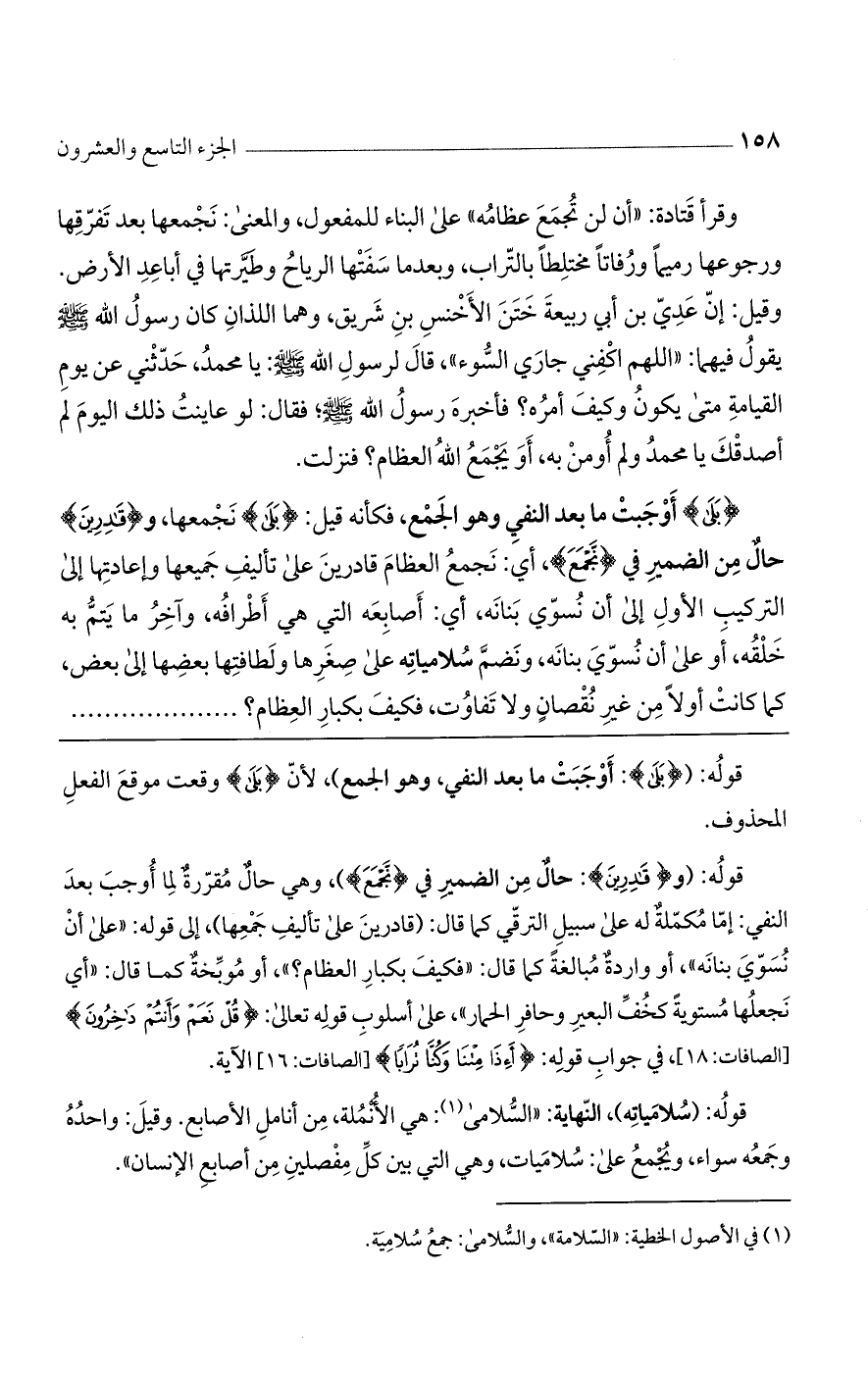 (بَلَى) أوجبت ما بعد النفي وهو الجمع، فكأنه قيل: (بَلَى) نجمعها، و (قَادِرِينَ) حال من الضمير في (نَّجْمَعَ)، أي: نجمع العظام قادرين على تأليف جميعها وإعادتها إلى التركيب الأول إلى أن نسوي بنانه، أي: أصابعه التي هي أطرافه، وآخر ما يتم به خلقه، أو على أن نسوي بنانه، ونضم سلامياته على صغرها ولطافتها بعضها إلى بعض، كما كانت أولا من غير نقصان ولا تفاوت، فكيف بكبار العظام؟