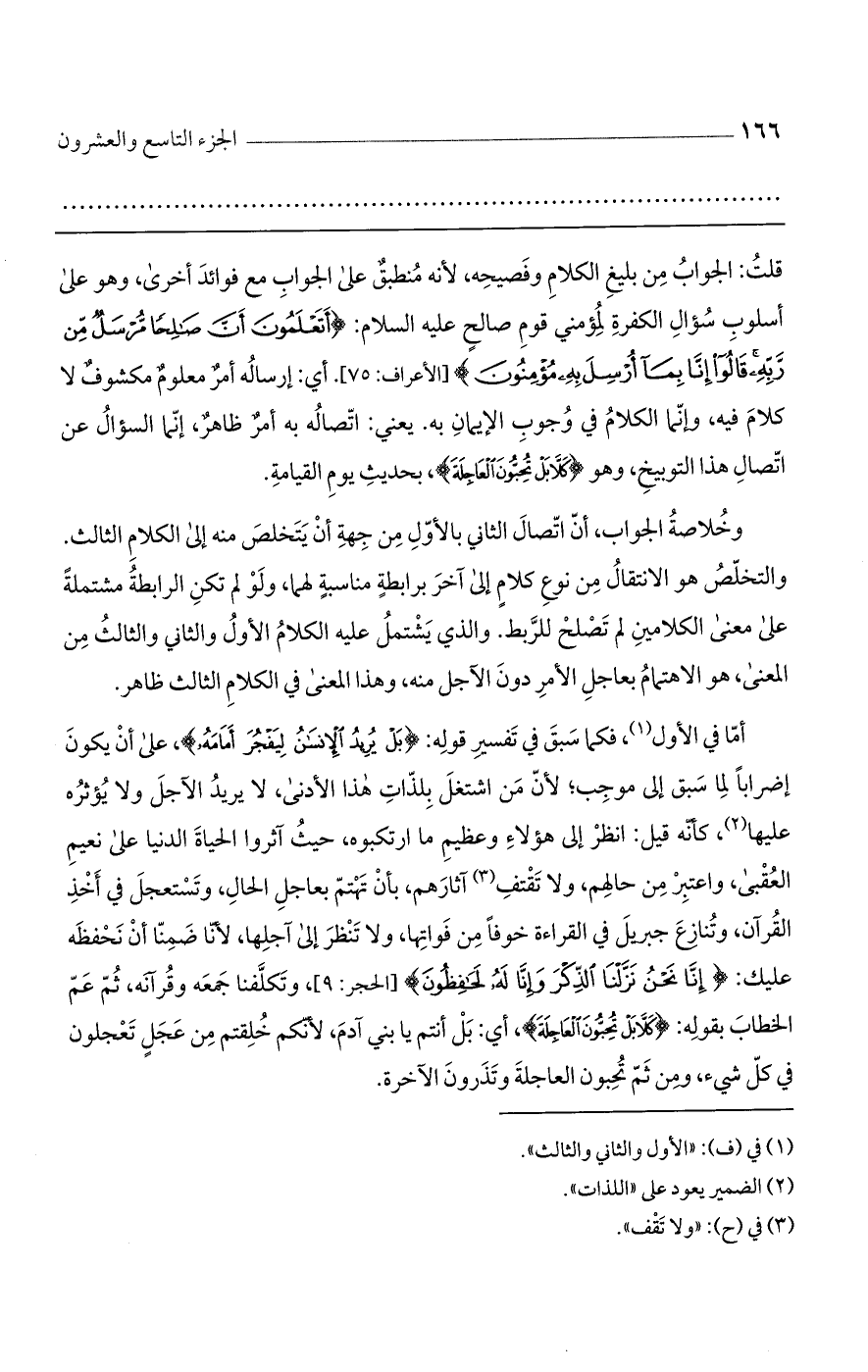 قلت: الجواب من بليغ الكلام وفصيحه، لأنه منطبق على الجواب مع فوائد أخرى، وهو على أسلوب سؤال الكفرة لمؤمني قوم صالح عليه السلام: {أَتَعْلَمُونَ أَنَّ صَالِحًا مُّرْسَلٌ مِّن رَّبِّهِ قَالُوا إِنَّا بِمَا أُرْسِلَ بِهِ مُؤْمِنُونَ} [الأعراف: 75]. أي: إرساله أمر معلوم مكشوف لا كلام فيه، وإنما الكلام في وجوب الإيمان به. يعني: اتصاله به أمر ظاهر، إنما السؤال عن اتصال هذا التوبيخ، وهو {كَلَّا بَلْ تُحِبُّونَ الْعَاجِلَةَ}، بحديث يوم القيامة.