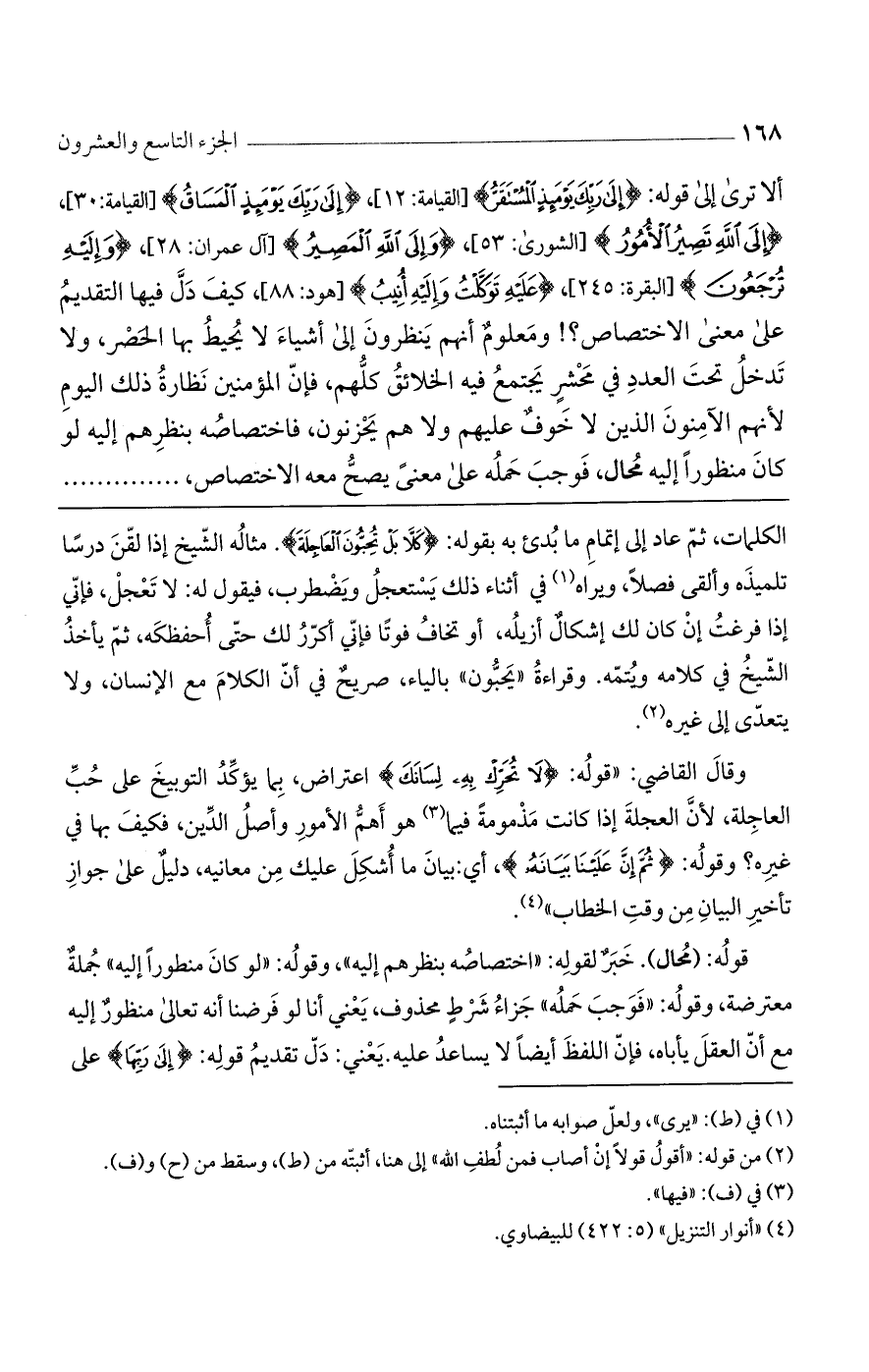 ألا ترى إلى قوله: (إلَى رَبِّكَ يَوْمَئِذٍ المُسْتَقَرُّ) [القيامة: 12]، (إلَى رَبِّكَ يَوْمَئِذٍ المَسَاقُ) [القيامة: 30]، (إلَى اللَّهِ تَصِيرُ الأُمُورُ) [السورى: 53]، (وإلَى اللَّهِ المَصِيرُ) [آل عمران: 28]، (وإلَيْهِ تُرْجَعُونَ) [البقرة: 245]، (عَلَيْهِ تَوَكَّلْتُ وإلَيْهِ أُنِيبُ) [هود: 88]، كيف دلّ فيها التقديم على معنى الاختصاص؟ ! ومعلوم أنهم ينظرون إلى أشياء لا يحيط بها الحصر، ولا تدخل تحت العدد في محشر يجتمع فيه الخلائق كلهم، فإنّ المؤمنين نظارة ذلك اليوم لأنهم الآمنون الذين لا خوف عليهم ولا هم يحزنون، فاختصاصه بنظرهم إليه لو كان منظوراً إليه محال، فوجب حمله على معنى يصح معه الاختصاص،