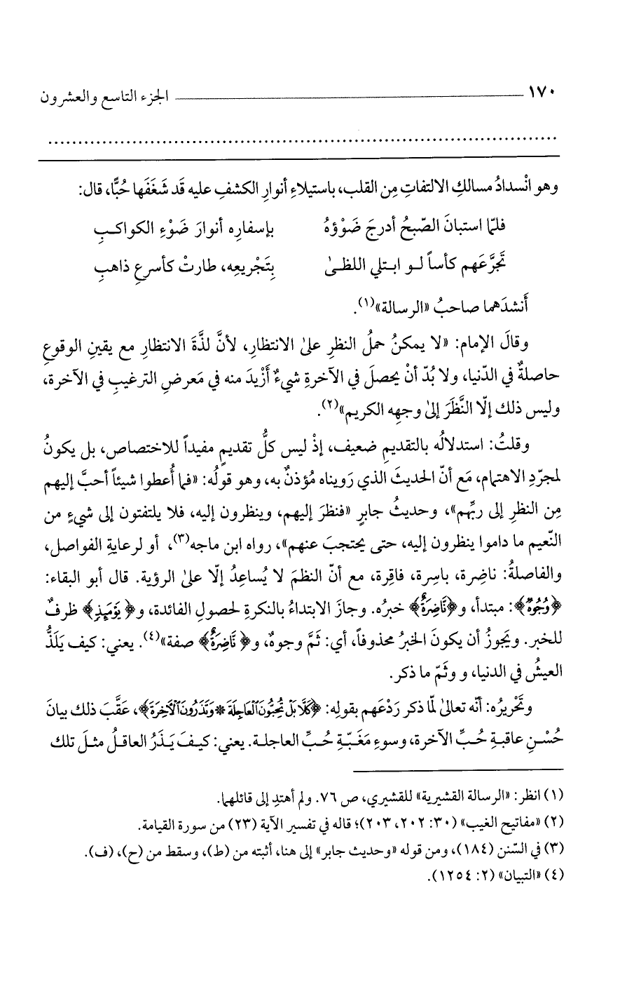 وقال الإمام: "لا يمكن حمل النظر على الانتظار، لأن لذة الانتظار مع يقين الوقوع حاصلة في الدنيا، ولا بد أن يحصل في الآخرة شيء أزيد منه في معرض الترغيب في الآخرة، وليس ذلك إلا النظر إلى وجهه الكريم".