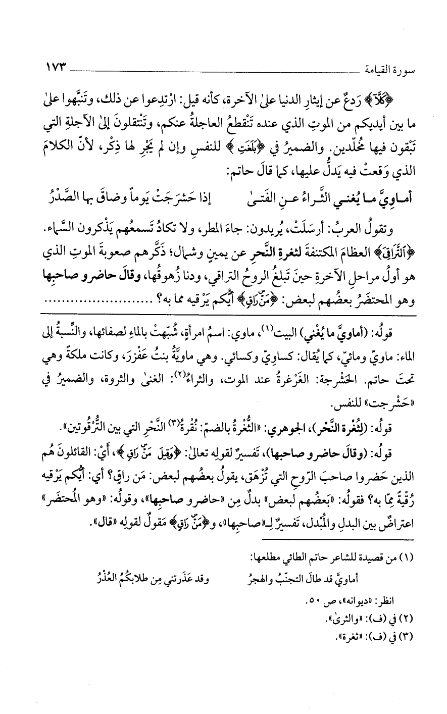وتقول العرب: أرسلت، يريدون: جاء المطر، ولا تكاد تسمعهم يذكرون السماء. (التَّرَاقِيَ) العظام المكتنفة لثغرة النحر عن يمين وشمال؛ ذكرهم صعوبة الموت الذي هو أول مراحل الآخرة حين تبلغ الروح التراقي، ودنا زهوقها، وقال حاضرو صاحبها وهو المحتضر بعضهم لبعض: (مَنْ رَاقٍ) أيكم يرقيه مما به؟