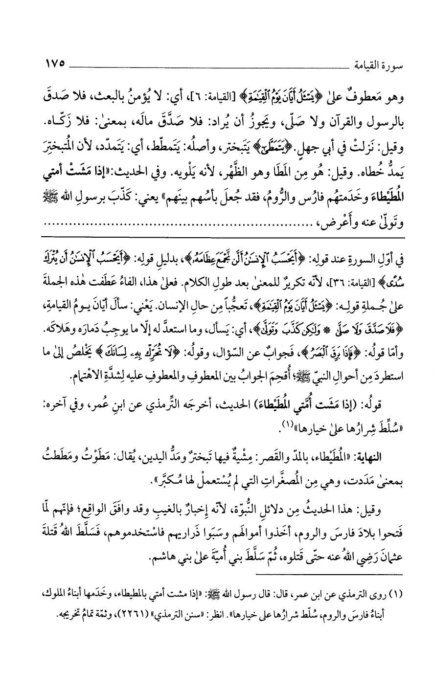في أول السورة عند قوله: {أَيَحْسَبُ الْإِنسَانُ أَلَّن نَّجْمَعَ عِظَامَهُ}، بدليل قوله: {أَيَحْسَبُ الْإِنسَانُ أَن يُتْرَكَ سُدًى} [القيامة: 36]، لأنه تكرير للمعنى بعد طول الكلام. فعلى هذا، عطفت هذه الجملة على جملة قوله: {يَسْئَلُ أَيَّانَ يَوْمُ الْقِيَامَةِ}، تعجباً من حال الإنسان. يعني: سأل أيان يوم القيامة، {فَلَا صَدَّقَ وَلَا صَلَّى (وَلَكِن كَذَّبَ وَتَوَلَّى}، أي: يسأل، وما استعد له إلا ما يوجب دماره وهلاكه. وأما قوله: {فَإِذَا بَرِقَ الْبَصَرُ}، فجواب عن السؤال، وقوله: {لَا تُحَرِّكْ بِهِ لِسَانَكَ} يخلص إلى ما استطرد من أحوال النبي? ، أُقحم الجواب بين المعطوف والمعطوف عليه لشدة الاهتمام.