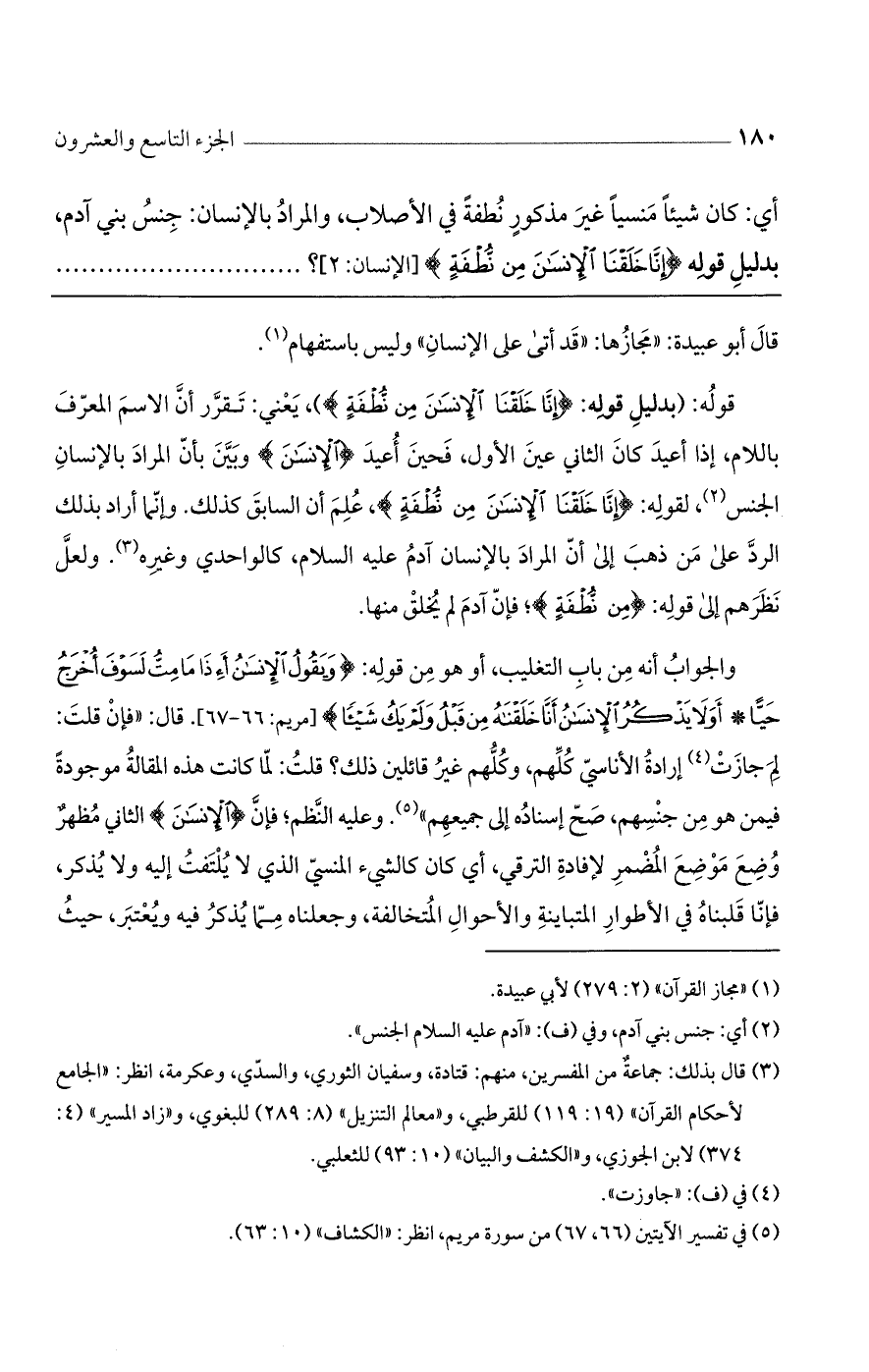 والجواب أنه من باب التغليب، أو من قوله: {وَيَقُولُ الْإِنسَانُ أَءِذَا مَا مِتُّ لَسَوْفَ أُخْرَجُ حَيًّا (أَوَ لَا يَذْكُرُ الْإِنسَانُ أَنَّا خَلَقْنَاهُ مِن قَبْلُ وَلَمْ يَكُ شَيْئًا} [مريم: 66 - 67]. قال: "فإن قلت: لِمَ جازت إرادة الأناسي كلهم، وكلهم غير قائلين ذلك؟ قلت: لما كانت هذه المقالة موجودة فيمن هو من جنسهم، صح إسناده إلى جميعهم". وعليه النظم؛ فإن {الْإِنسَانَ} الثاني مُظهر وضع موضع المضمر لإفادة الترقي، أي كان الشيء المنسي الذي لا يُلتفت إليه ولا يُذكر، فإنا قلبناه في الأطوار المتباينة والأحوال المُتخالفة، وجعلناه مما يذكر فيه ويعتبر، حيث