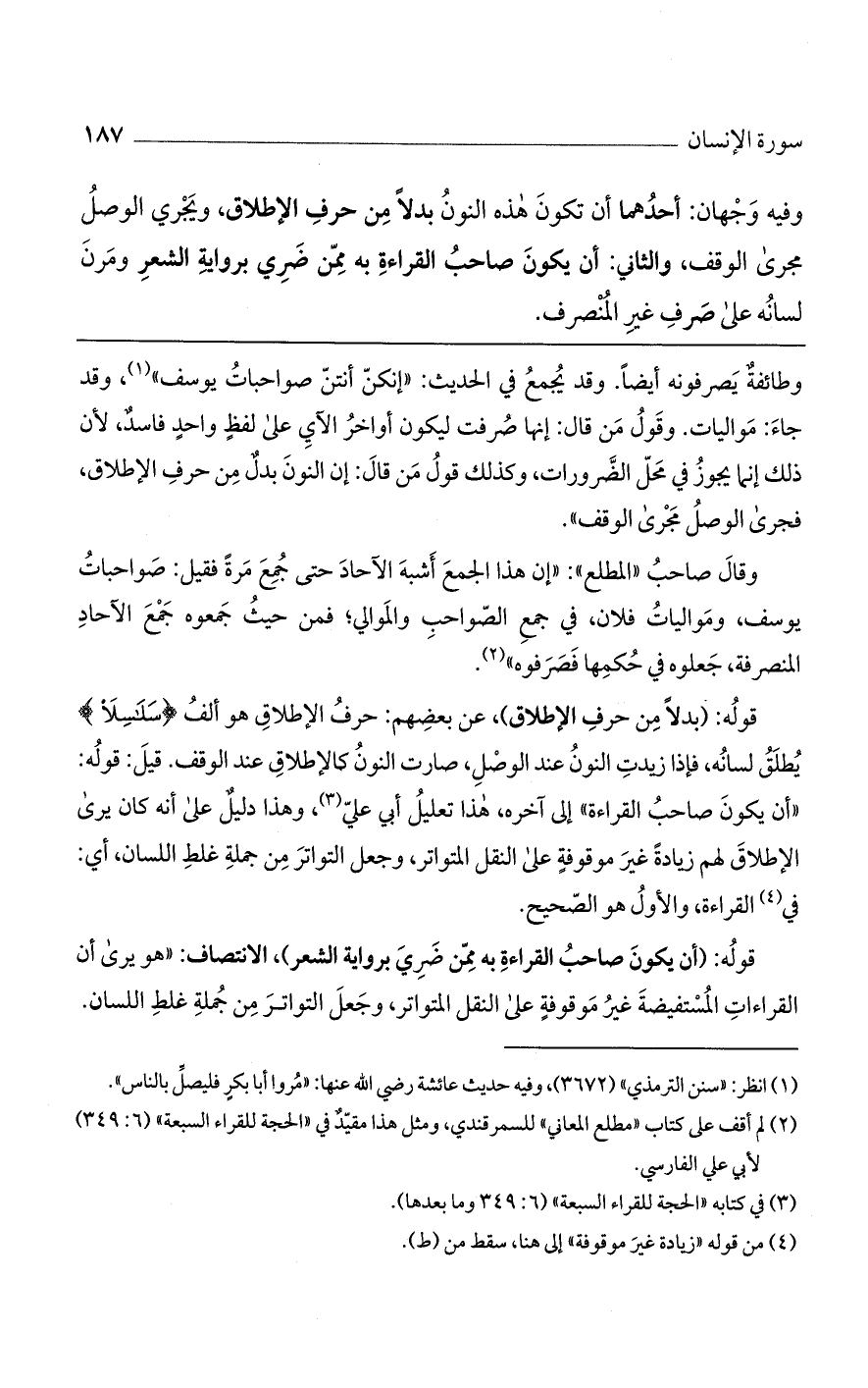 قوله: (بدلاً من حرف الإطلاق)، عن بعضهم: حرف الإطلاق هو ألف {سَلَاسِلَا} يطلق لسانه، فإذا زيدت النون عند الوصل، صارت النون كالإطلاق عند الوقف. قيل: قوله: "أن يكون صاحب القراءة" إلى آخره، هذا تعليل أبي علي، وهذا ديل على أنه كان يرى الإطلاق لهم زيادة غير موقوفة على النقل المتواتر، وجعل التواتر من جملة غلط اللسان، أي: في القراءة، والأول هو الصحيح.
