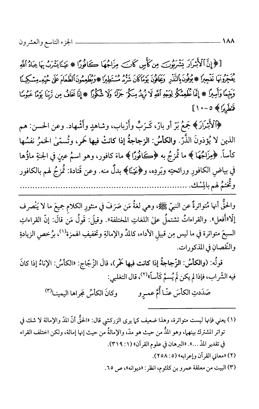 (إِنَّ الْأَبْرارَ يَشْرَبُونَ مِنْ كَاسٍ كانَ مِزاجُها كافُوراً * عَيْناً يَشْرَبُ بِها عِبادُ اللَّهِ يُفَجِّرُونَها تَفْجِيراً * يُوفُونَ بِالنَّذْرِ وَيَخافُونَ يَوْماً كانَ شَرُّهُ مُسْتَطِيراً * وَيُطْعِمُونَ الطَّعامَ عَلى حُبِّهِ مِسْكِيناً وَيَتِيماً وَأَسِيراً * إِنَّما نُطْعِمُكُمْ لِوَجْهِ اللَّهِ لا نُرِيدُ مِنْكُمْ جَزاءً وَلا شُكُوراً *إِنَّا نَخافُ مِنْ رَبِّنا يَوْماً عَبُوساً قَمْطَرِيراً) 5 - 10)