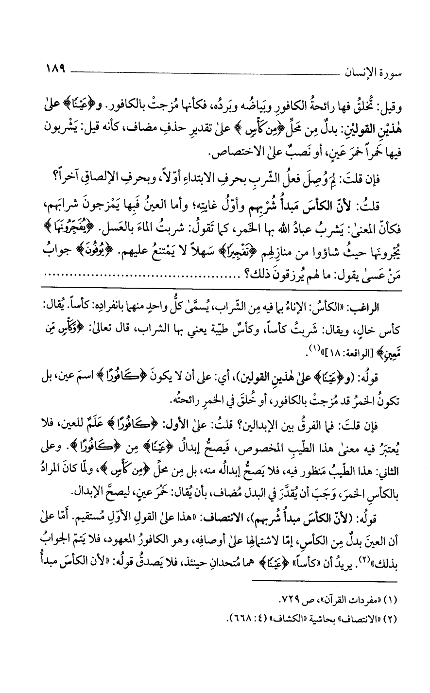 فإن قلت: فما الفرق بين الإبدالين؟ قلت: على الأول: {كَافُورًا} علم للعين، فلا يُعتبر فيه معنى هذا الطيب المخصوص، فيصح إبدال {عَيْنًا} من {كَافُورًا}. وعلى الثاني: هذا الطيب منظور فيه، فلا يصح إبداله منه، بل من محل {مِن كَأْسٍ}، ولما كان المراد بالكأس الخمر، وجب أن يُقدر في البدل مُضاف، بأن يقال: خمر عين، ليصح الإبدال.