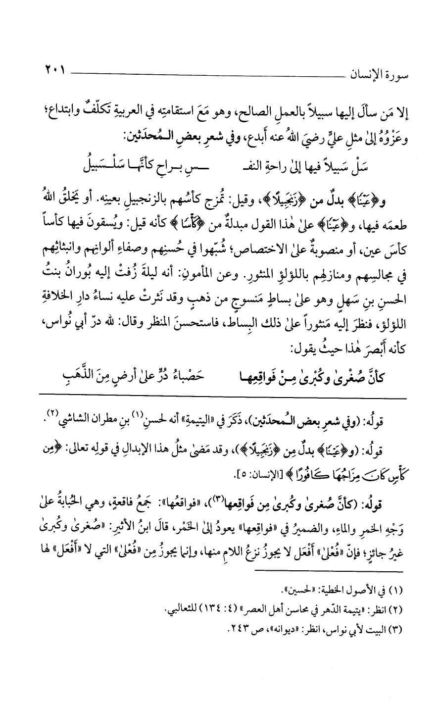 و(عَيْناً) بدلٌ من (زَنْجَبِيلًا)، وقيل: تمزج كأسهم بالزنجبيل بعينه. أو يخلق الله طعمه فيها. و (عَيْنا) على هذا القول مبدلةٌ من (كَاساً) كأنه قيل: ويسقون فيها كأساً كأس عين، أو منصوبةٌ على الاختصاص؛ شبهوا في حسنهم وصفاء ألوانهم وانبثاثهم في مجالسهم ومنازلهم باللؤلؤ المنثور. وعن المأمون: أنه ليلة زفت إليه بوران بنت الحسن بن سهلٍ وهو على بساطٍ منسوجٍ من ذهبٍ وقد نثرت عليه نساء دار الخلافة اللؤلؤ، فنظر إليه منثوراً على ذلك البساط، فاستحسن المنظر وقال: لله درّ أبى نواس، وكأنه أبصر هذا حيث يقول:
