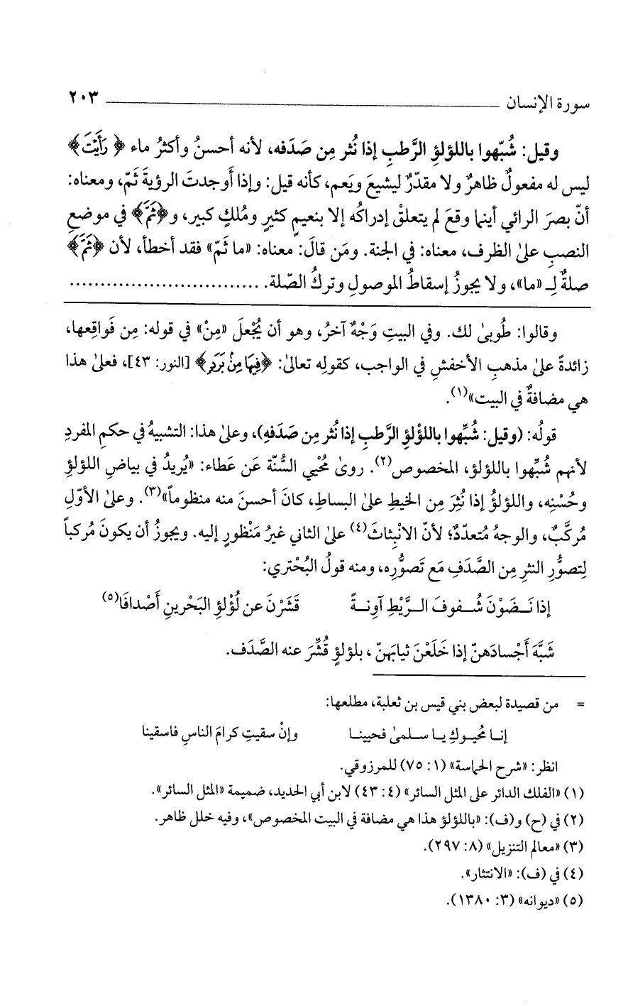 وقيل: شبهوا باللؤلؤ الرطب إذا نثر من صدفه، لأنه أحسن وأكثر ماء (رَأَيْتَ) ليس له مفعولٌ ظاهرٌ ولا مقدرٌ ليشيع ويعم، كأنه قيل: وإذا أوجدت الرؤية ثم، ومعناه: أن بصر الرائي أينما وقع لم يتعلق إدراكه إلا بنعيمٍ كثيرٍ وملكٍ كبير، و (ثَمّ) في موضع النصب على الظرف، معناه: في الجنة. ومن قال: معناه: «ما ثم» فقد أخطأ، لأن «ثم» صلة ل- "ما"، ولا يجوز إسقاط الموصول وترك الصلة