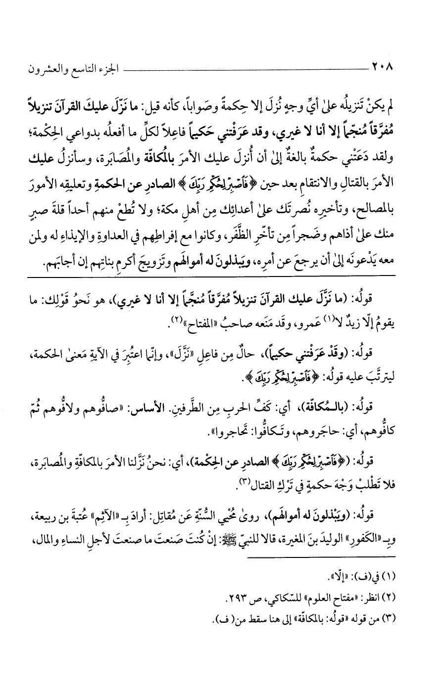 قوله: ({فَاصْبِرْ لِحُكْمِ رَبِّكَ} الصادر عن الحكمة)، أي: نحن نزلنا الأمر بالمكافة والمصابرة، فلا تطلب وجه حكمة في ترك القتال.