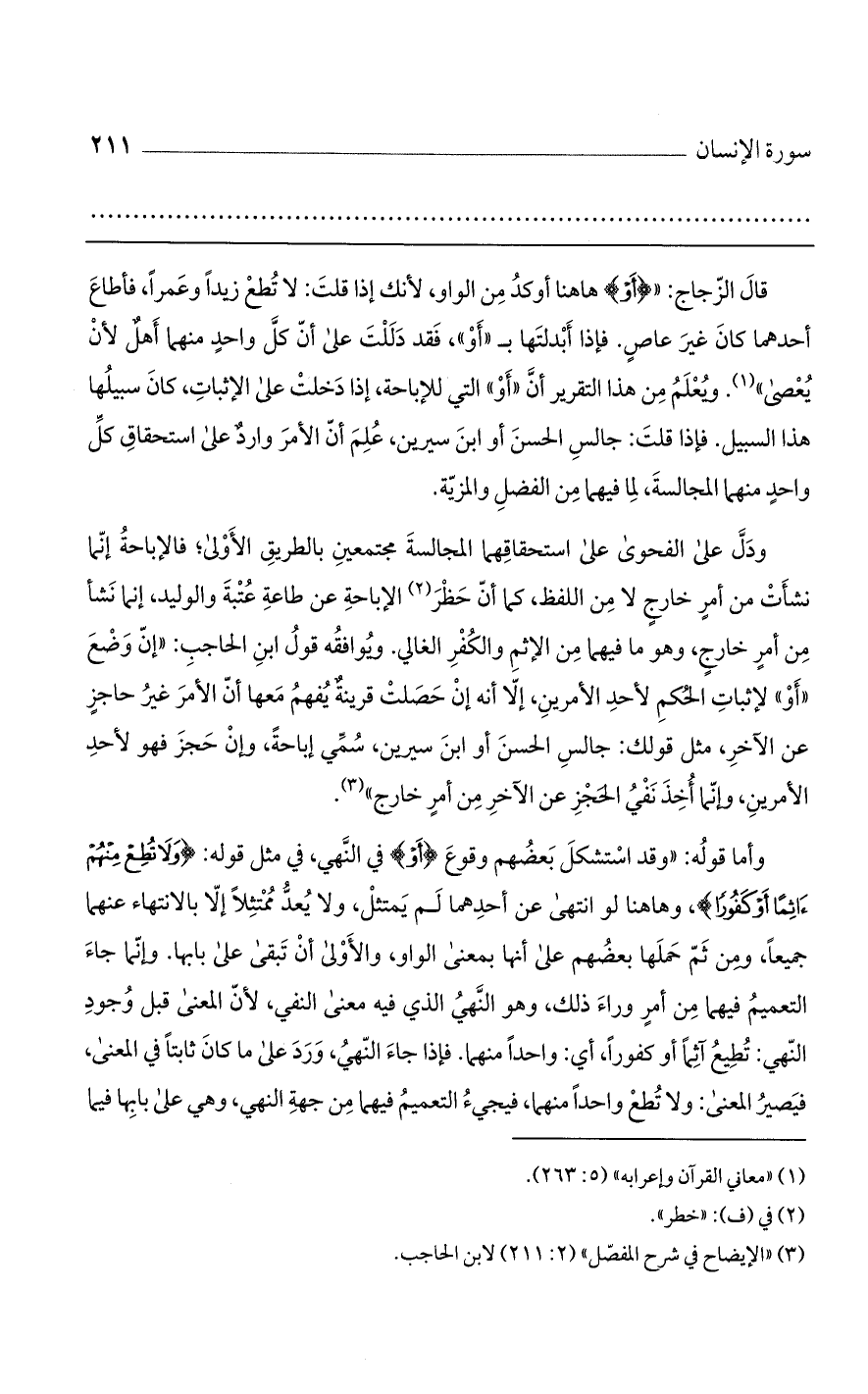 قال الزجاج: " {أَوْ} هاهنا أوكد من الواو، لأنك إذا قلت: لا تُطع زيداً وعمراً، فأطاع أحدهما كان غير عاصٍ. فإن أبدلتها بـ "أَوْ"، فقد دللت على أن كل واحد منهما أهل لأن يُعصى". ويُعلم من هذا التقرير أن "أو" التي للإباحة، إذا دخلت على الإثبات، كان سبيلها هذا السبيل. فإذا قلت: جالس الحسن أو ابن سيرين، علم أن الأمر وارد على استحقاق كل واحد منهما المجالسة، لما فيهما من الفضل والمزية.