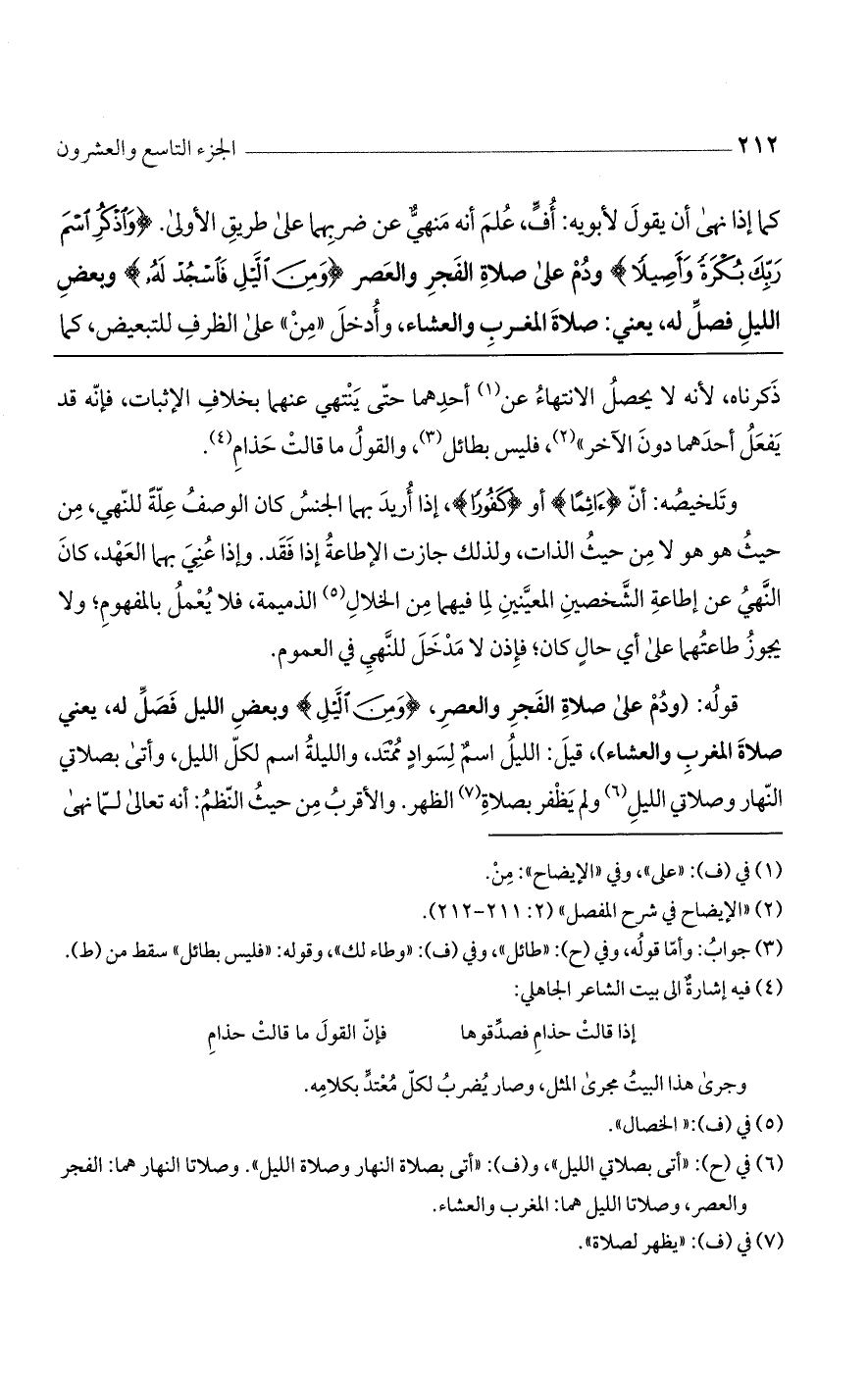 قوله: (ودُم على صلاة الفجر والعصر، {وَمِنَ الَّيْلِ} وبعض الليل فصَلِّ له، يعني صلاة المغرب والعشاء)، قيل: الليل اسم لسواد ممتد، والليلة اسم لكل الليل، وأتى بصلاتي النهار وصلاتي الليل ولم يظفر بصلاة الظهر. والأقرب من حيث النّظم: أنه تعالى لما نهى