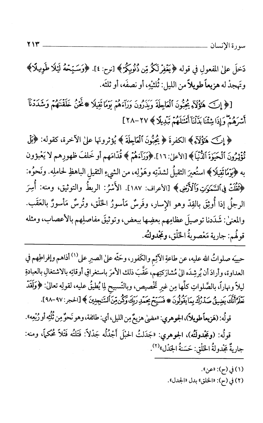 (إِنَّ هؤُلاءِ) الكفرة (يُحِبُّونَ الْعاجِلَةَ) يؤثرونها على الآخرة، كقوله: (بَلْ تُؤْثِرُونَ الْحَياةَ الدُّنْيا) [الأعلي: 16]. (وَراءَهُمْ) قدّامهم أو خلف ظهورهم لا يعبئون به (يَوْماً ثَقِيلًا) استعير الثقيل لشدّته وهو له، من الشيء الثقيل الباهظ لحامله. ونحوه: (ثَقُلَتْ فِي السَّماواتِ وَالْأَرْضِ) [الأعراف: 187]. الأسر: الربط والتوثيق، ومنه: أسر الرجل إذا أوثق بالقدّ وهو الإسار، وفرسٌ مأسور الخلق، وترسٌُ مأسورٌُ بالعقب. والمعنى: شددنا توصيل عظامهم بعضها ببعض، وتوثيق مفاصلهم بالأعصاب، ومثله قولهم: جارية معصوبة الخلق، ومجدولته.