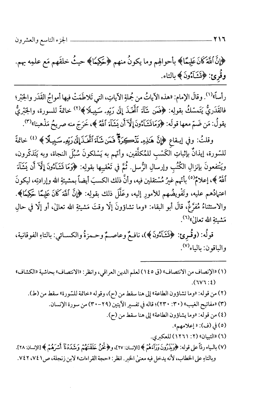 قوله: (وقُرئ: {تَشَاءُونَ})، نافع وعاصم وحمزة والكسائي: بالتاء الفوقانية، والباقون: بالياء.