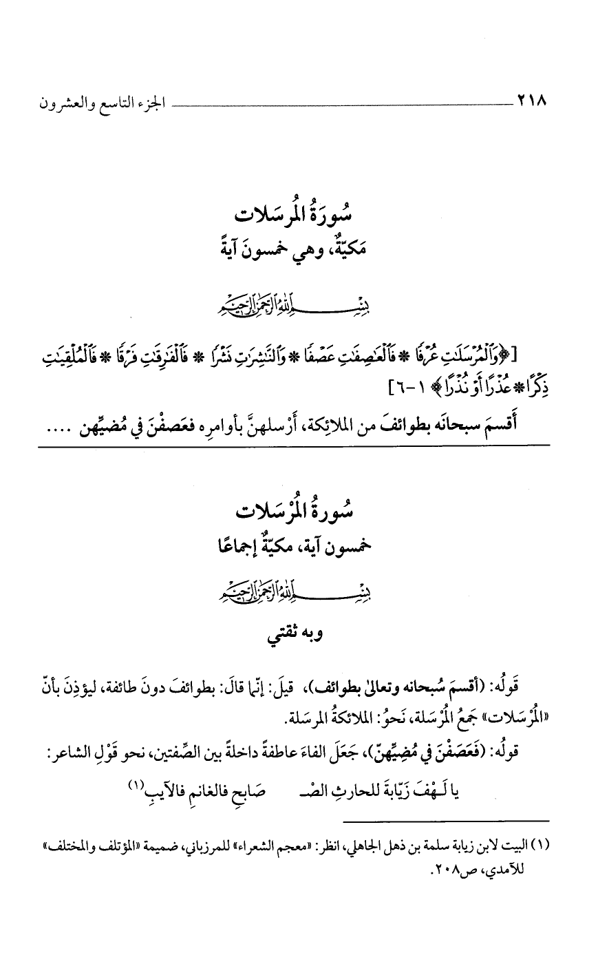 [(وَالْمُرْسَلاتِ عُرْفاً * فَالْعاصِفاتِ عَصْفاً * وَالنَّاشِراتِ نَشْراً * فَالْفارِقاتِ فَرْقاً * فَالْمُلْقِياتِ ذِكْراً * عُذْراً أَوْ نُذْراً) 1 - 6]