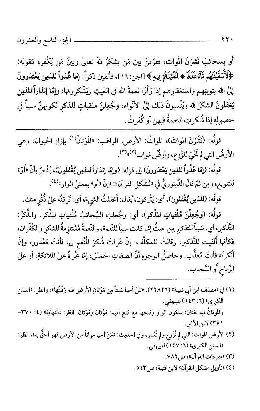أو بسحائب نشرن الموات، ففرّقن بين هن يشكر لله تعالى وبين من يكفر، كقوله (لَأَسْقَيْناهُمْ ماءً غَدَقاً * لِنَفْتِنَهُمْ فِيهِ) [الجن: 16]، فألقين ذكرا: ً إمّا عذراً للذين يعتذرون إلى الله بتوبتهم واستغفارهم إذا رأوا نعمة الله في الغيث ويشكرونها، وإما إنذاراً الذين يغفلون الشكر لله وينسبون ذلك إلى الأنواء، وجعلن ملقياتٍ للذكر لكونهن سبباً في حصوله إذا شكرت النعمة فيهن أو كفرت.