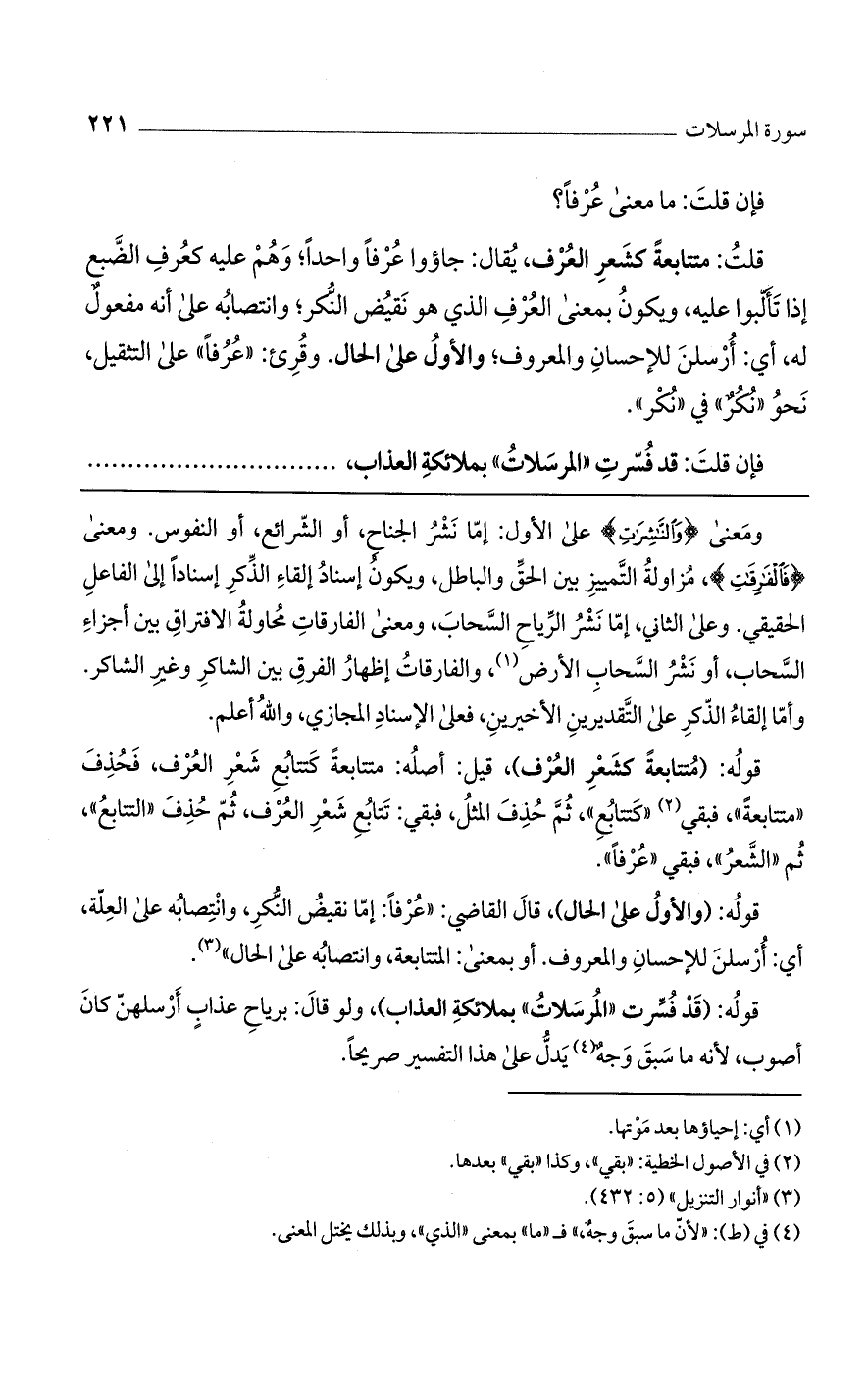 قوله: (قد فُسِّرت "المرسلات" بملائكة العذاب)، ولو قال: برياح عذاب أرسلهن كان أصوب، لأنه ما سبق وجه يدل على هذا التفسير صريحاً.