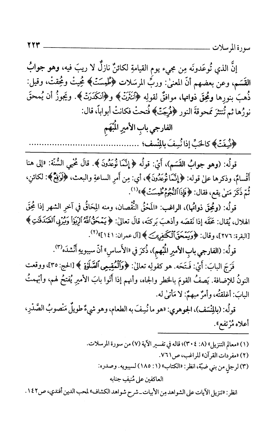 إن الذي توعدونه من مجيء يوم القيامة لكائنٌ نازلٌ لا ريب فيه، وهو جواب القسم، وعن بعضهم أن المعنى: ورب المرسلات (طُمِسَتْ) محيت ومحقت، وقيل: ذهب بنورها ومحق ذواتها، موافقٌ لقوله (انْتَثَرَتْ) و (انْكَدَرَتْ). ويجوز أن يمحق نورها ثم تنتثر ممحوقة النور (فُرِجَتْ) فتحت فكانت أبواباً، قال: