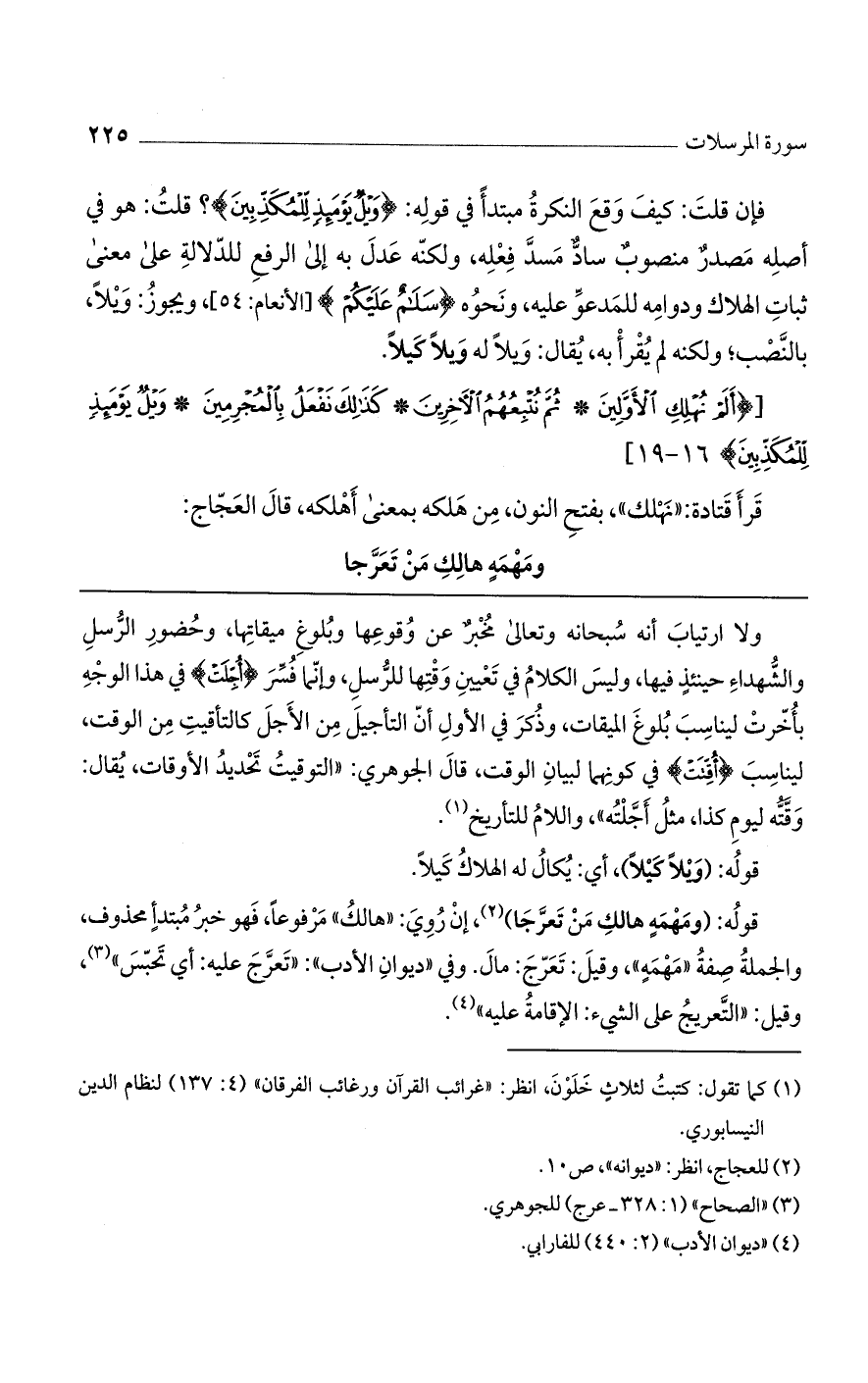 فإن قلت: كيف وقع النكرة مبتدأ في قوله: (وَيْلٌ يَوْمَئِذٍ لِلْمُكَذِّبِينَ)؟ قلت: هو في أصله مصدرٌ منصوبٌ سادٌّ مسدّ فعله، ولكنه عدل به إلى الرفع للدلالة على معنى ثبات الهلاك ودوامه للمدعو عليه، ونحوه (سَلامٌ عَلَيْكُمْ) [الأنعام: 54]، ويجوز: ويلا، بالنصب؛ ولكنه لم يقرأ به، يقال: ويلاً له ويلاً كيلاً.