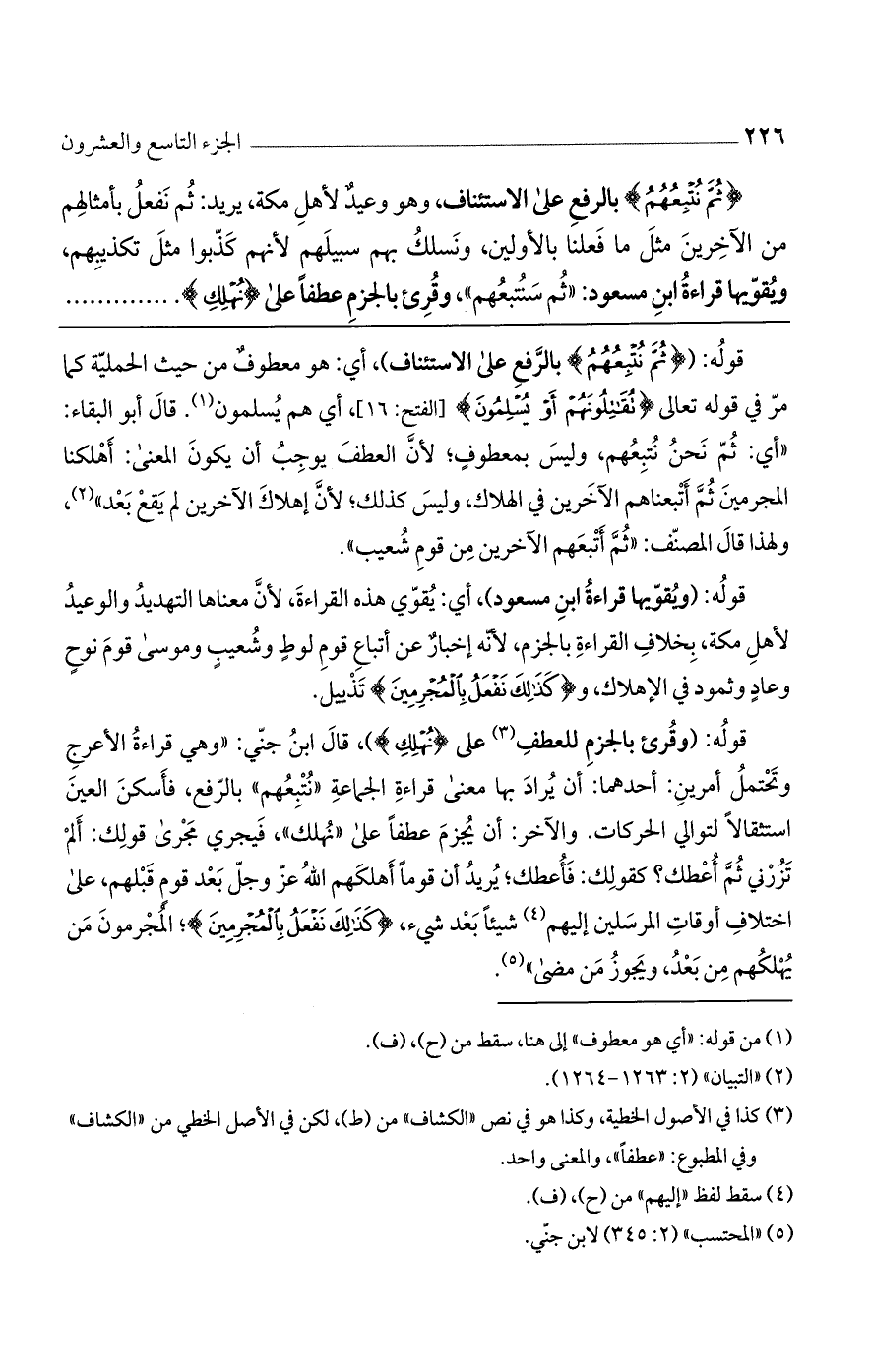 قوله: (وقُرئ بالجزم للعطف على {نُهْلِكِ})، قال ابن جني: "وهي قراءة الأعرج وتحتمل أمرين: أحدهما: ان يُراد بها معنى قراءة الجماعة "نُتبعهم" بالرفع، فأسكن العين استثقالاً لتوالي الحركات. والآخر: أن يُجزم عطفاً على "نُهلك"، فيجري مجرى قولك: ألم تزرني ثم أعطك؟ كقولك: فأُعطك؛ يريد أن قوماً أهلكهم الله عز وجل بعد قوم قبلهم، على اختلاف أوقات المرسلين إليهم شيئاً بعد شيء، {كَذَلِكَ نَفْعَلُ بِالْمُجْرِمِينَ}؛ المجرمون من يُهلكهم من بعد، ويجوز من مضى".