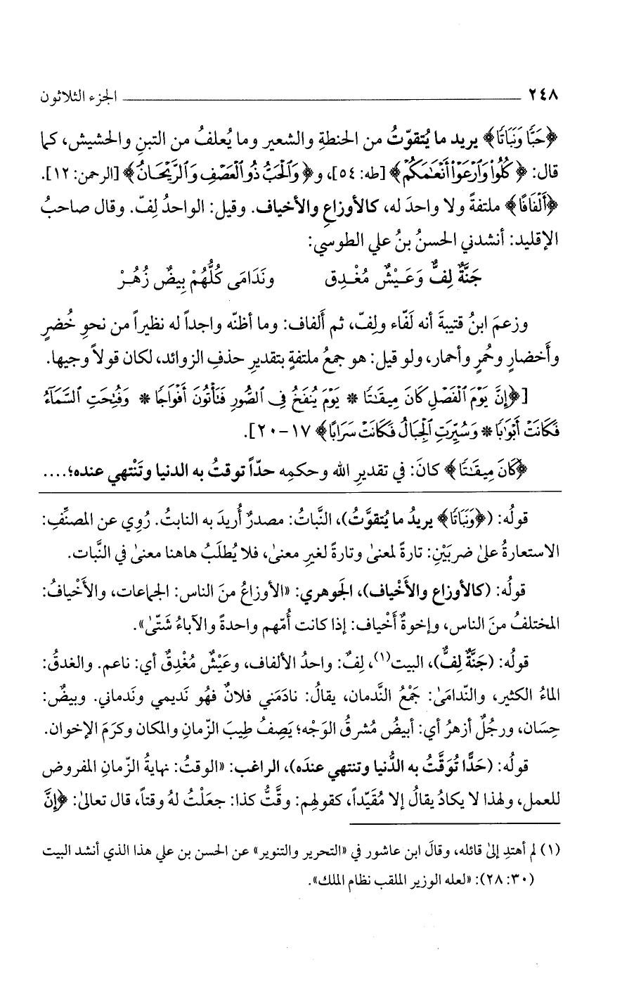 ) حَبًّا وَنَباتاً (يريد ما يتقوّت من الحنطة والشعير وما يعتلف من التبن والحشيش، كما قال: ) كُلُوا وَارْعَوْا أَنْعامَكُمْ ([طه: 54]، وَ (الْحَبُّ ذُو الْعَصْفِ وَالرَّيْحانُ) [الرحمن: 12]. (ألْفافاً) ملتفةً ولا واحد له، كالأوزاع والأخياف. وقيل: الواحد لف. وقال صاحب الإقليد: أنشدنى الحسن بن على الطوسي: