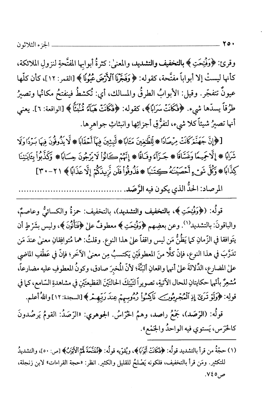قوله: ({وَفُتِحَتِ}، بالتخفيف والتشديد)، بالتخفيف: حمزة والكسائي وعاصم، والباقون: بالتشديد. وعن بعضهم {وَفُتِحَتِ} معطوف على {فَتَأْتُونَ}، وليس بشرط أن يتوافقا في الزمان كما يظن من ليس واقفاً على هذا النوع. وقلت: هما متوافقان معنى عند من تدرب في هذا النوع، فإن كلاً من المعطوفين يكتسب من معنى الآخر؛ فإن عطف الماضي على المضارع، الدلالة على أنهما واقعان البتة؛ لأن المخبر صادق، وكون المعطوف عليه مضارعاً، مشعر بأنهما حكايتان للحال الآتية، تصويراً لتينك الحالتين الفظيعنتين في مشاهدة السامع، كما في قوله: {وَلَوْ تَرَى إِذِ الْمُجْرِمُونَ نَاكِسُوا رُءُوسِهِمْ عِندَ رَبِّهِمْ} [السجدة: 12] والله أعلم.