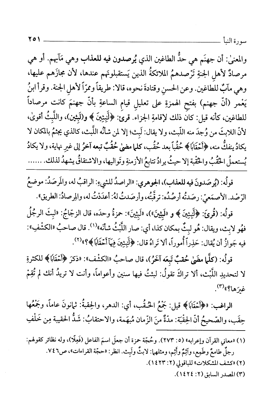 والمعنى: أن جهنم هي حد الطاغين الذي يرصدون فيه للعذاب وهي مآبهم. أو هي مرصاد لأهل الجنة ترصدهم الملائكة الذين يستقبلونهم عندها، لأن مجازهم عليها، وهي مآب للطاغين. وعن الحسن وقتادة نحوه، قالا: طريقاً وممراً لأهل الجنة. وقرأ ابن يعمر: (أن جهنم) بفتح الهمزة على تعليل قيام الساعة بأن جهنم كانت مرصاداً للطاغين، كأنه قيل: كان ذلك لإقامة الجزاء. قرئ: (لابِثِينَ) و (لَبِثين)، واللبث أقوى، لأن اللابث من وجد منه اللبث، ولا يقال: لبث؛ إلا لمن شأنه اللبث، كالذي يجثم بالمكان لا يكاد ينفك منه، (أَحْقَابًا) حقباً بعد حقب، كلما مضى حقب تبعه آخر إلى غير نهاية، ولا يكاد يستعمل الحقب والحقبة إلا حيث يراد تتابع الأزمنة وتواليها، والاشتقاق يشهد لذلك .......