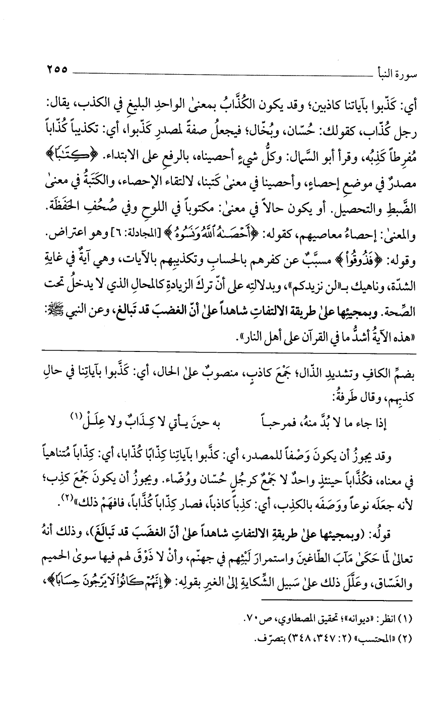 وقد يجوز أن يكون وصفاً للمصدر، أي: كذبوا بآياتنا كذاباً كُذابا، أي: كِذاباً مُتناهياً في معناه، فكذاباً حينئذ واحد لا جمع كرجل حُسان ووضاء. ويجوز أن يكون جمع كذب؛ لأنه جعله نوعاً ووصفه بالكذب، أي: كذباً كاذباً، فصار كِذاباً كُذاباً، فافهم ذلك".