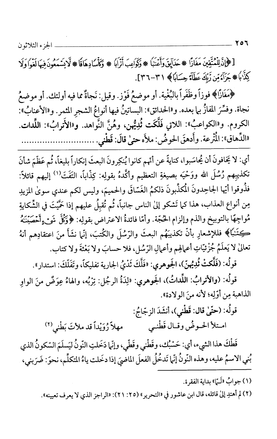 (مَفَازًا) فوزاً وظفراً بالبغية. أو موضع فوز. وقيل: نجاة مما فيه أولئك. أو موضع نجاة. وفسر المفاز بما بعده. «والحدائق»: البساتين فيها أنواع الشجر المثمر. و «الأعناب»: الكروم. و «الكواعب»: اللاتي فلكت ثدييهن، وهن النواهد. و «الأتراب»: اللدات. «الدهاق»: المترعة. وأدهق الحوض: ملأه حتى قال: قطني