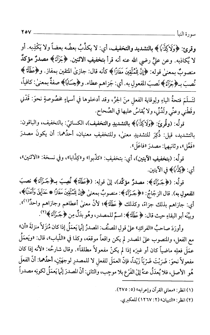 وقرئ: (ولا كِذَّابًا) بالتشديد والتخفيف، أي: لا يكذب بعضهم بعضاً ولا يكذبه. أو لا يكاذبه. وعن علي رضي الله عنه أنه قرأ بتخفيف الاثنين (جَزَاءً) مصدر مؤكد منصوب بمعنى قوله: (إنَّ لِلْمُتَّقِينَ مَفَازًا) كأنه قال: جازى المتقين بمفاز. و (عَطَاءً) نصب بـ (جَزَاءً) نصب المفعول به. أي: جزاهم عطاء. و (حِسَابًا) صفة بمعنى: كافياً،