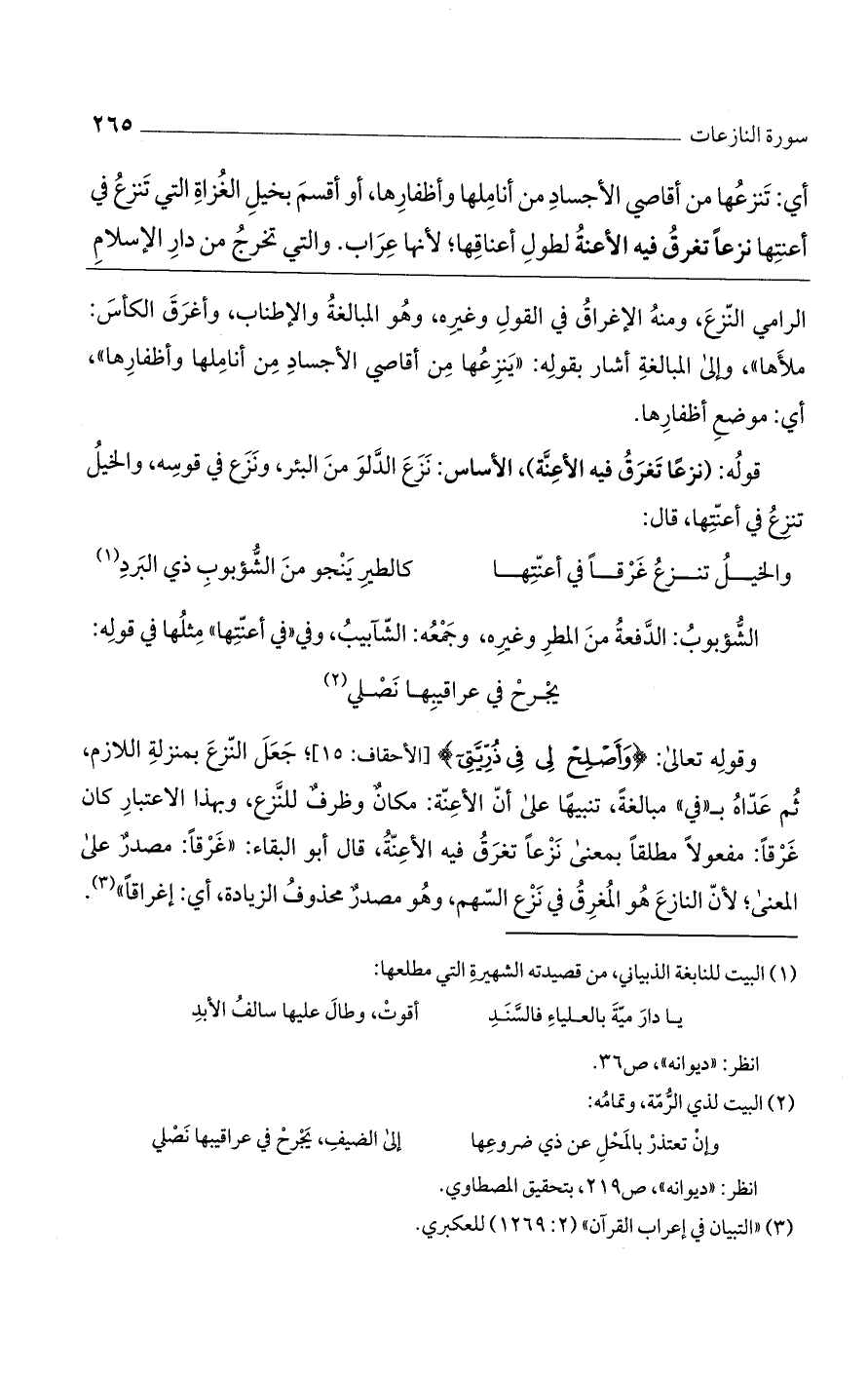 وقوله تعالى: {وَأَصْلِحْ لِي فِي ذُرِّيَّتِي} [الأحقاب: 15]؛ جعل النزه بمنزلة اللازم، ثم عداه بـ "في" مبالغة، تنبيهاً على أن الأعنة: مكان وظرف للنزع، وبهذا الاعتبار كان غرقاً: مفعولاً مطلقاً بمعنى نزعاً تغرق فيه الأعنة، قال أبو البقاء: "غرقاً: مصدر على المعنى؛ لأن النازع هو المغرق في نزع السهم، وهو مصدر محذوف الزيادة، أي: إغراقاً".