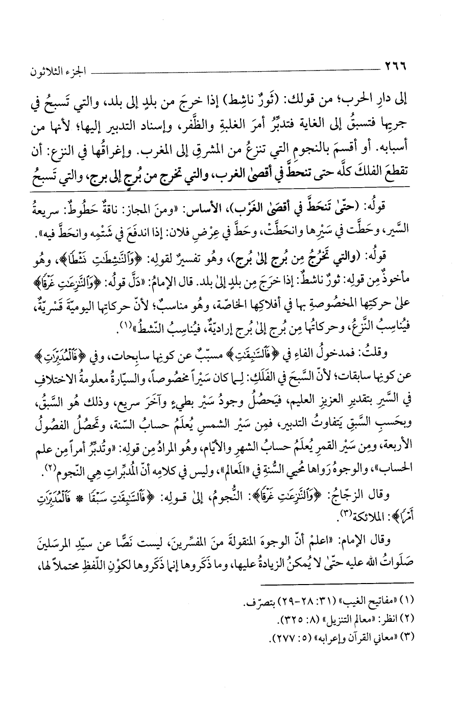 قوله: (والتي تخرج من برج إلى برج)، وهو تفسير لقوله: {وَالنَّاشِطَاتِ نَشْطًا}، وهو مأخوذ من قوله: ثور ناشط: إذا خرج من بلد إلى بلد. قال الإمام: "دل قوله: {وَالنَّازِعَاتِ غَرْقًا} على حركتها المخصوصة بها في أفلاكها الخاصة، وهو مناسب؛ لأن حركاتها اليومية قسرية، فيناسب النزع، وحركاتها من برج إلى برج إرادية، فيناسب النشط".