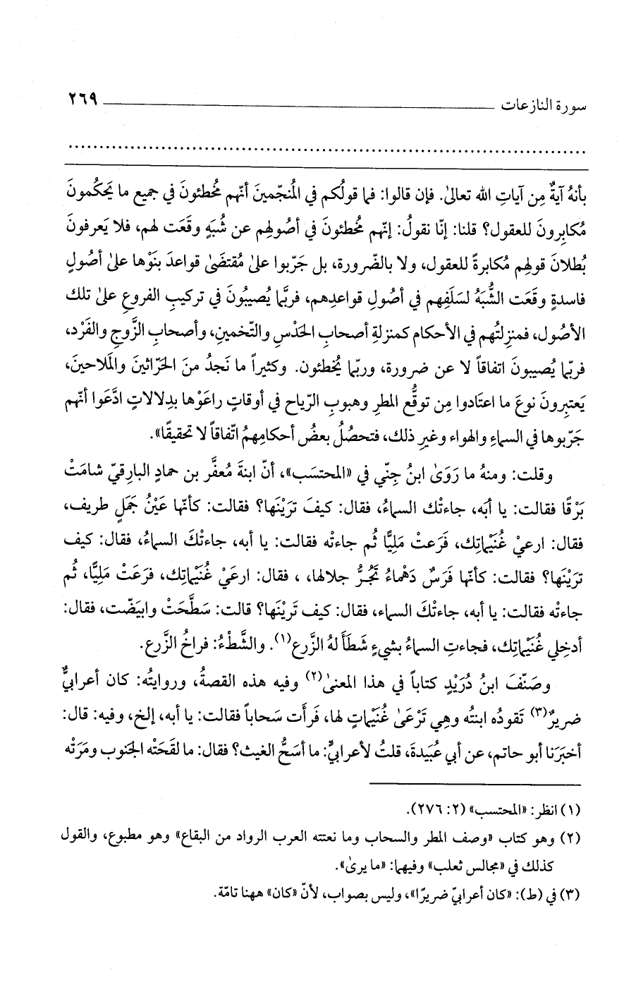 بأنه آية من آيات الله تعالى. فإن قالوا: فما قولكم في المنجمين أنهم مخطئون في جميع ما يحكمون مكابرون للعقول؟ قلنا: إنا نقول: إنهم مخطئون في أصولهم عن شبه وقعت لهم، فلا يعرفون بطلان قولهم مكابرة للعقول، ولا بالضرورة، بل جربوا على مقتضى قواعد بنوها على أصول فاسدة وقعت الشبه لسلفهم في أصول قواعدهم، فربما يصيبون في تركيب الفروع على تلك الأصول، فمنزلتهم في الأحكام كمنزلة أصحاب الحدس والتخمين، وأصحاب الزوج والفرد، فربما يصيبون اتفاقاً لا عن ضرورة، وربما يخطئون. وكثيراً ما نجد من الحراثين والملاحين، يعتبرون نوع ما اعتادوا من توقع المطر وهبوب الرياح في أوقات راعوها بدلالات ادعوا أنهم جربوها في السماء والهواء وغير ذلك، فتحصل بعض أحكامهم اتفاقاً لا تحقيقاً".