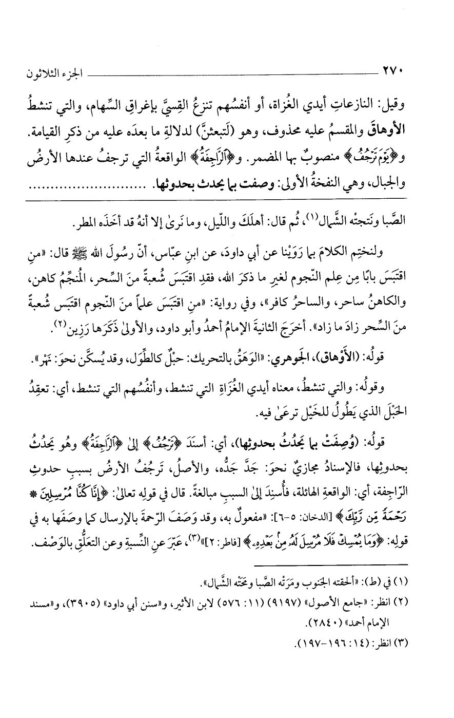 وقيل: النازعات أيدي الغزاة، أو أنفسهم تنزع القسي بإغراق السهام، والتي تنشط الأوهاق والمقسم عليه محذوف، وهو (لتبعثن) لدلالة ما بعده عليه من ذكر القيامة. و (يَوْمَ تَرْجُفُ) منصوب بهذا المضمر. و (الرَّاجِفَةُ) الواقعة التي ترجف عندها الأرض والجبال، وهي النفخة الأولى: وصفت بما يحدث بحدوثها