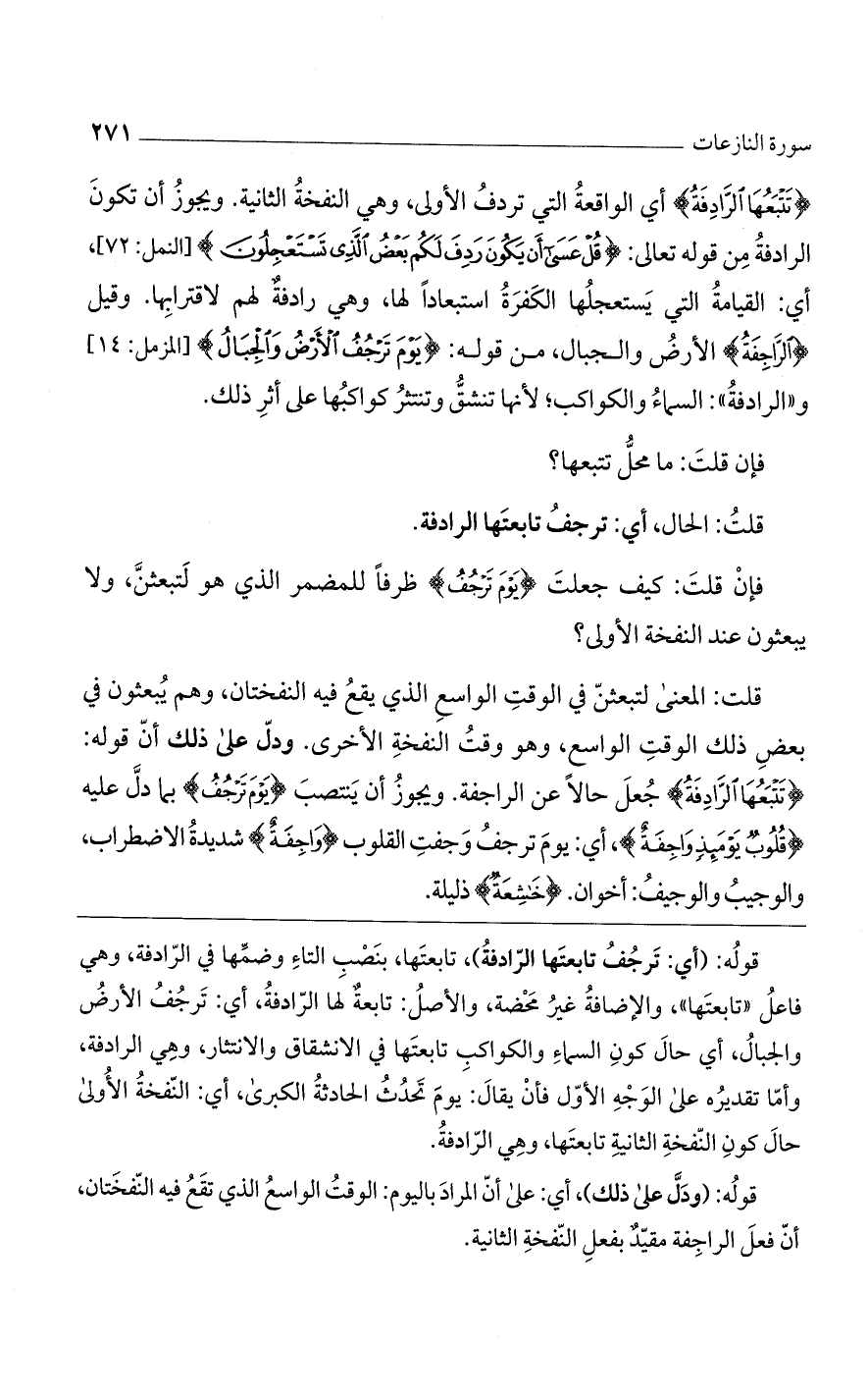 قوله: (أي: ترجف تابعتها الرادفة)، تابعتها، بنصب التاء وضمها في الرادفة، وهي فاعل "تابعتها"، والإضافة غير محضة، والأصل: تابعة لها الرادفة، أي: ترجف الأرض والجبال، أي حال كون السماء والكواكب تابعتها في الانشقاق والانتثار، وهي الرادفة، وأما تقديره على الوجه الأول فأن يقال: يوم تحدث الحادثة الكبرى، أي: النفخة الأولى حال كون الفنخة الثانية تابعتها، وهي الرادفة.